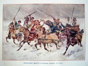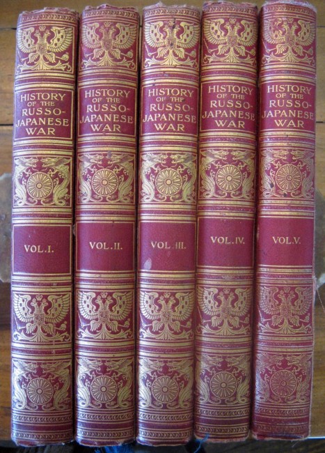 Illustrated history in five vols. Colour and b/w illustrations. Red boards, gilt lettering to spine. Some of the volumes have slight insect damage. Bindings are a little loose and corners bumped. Slight foxing. Covers the 1904-5 Russo-Japanese War.