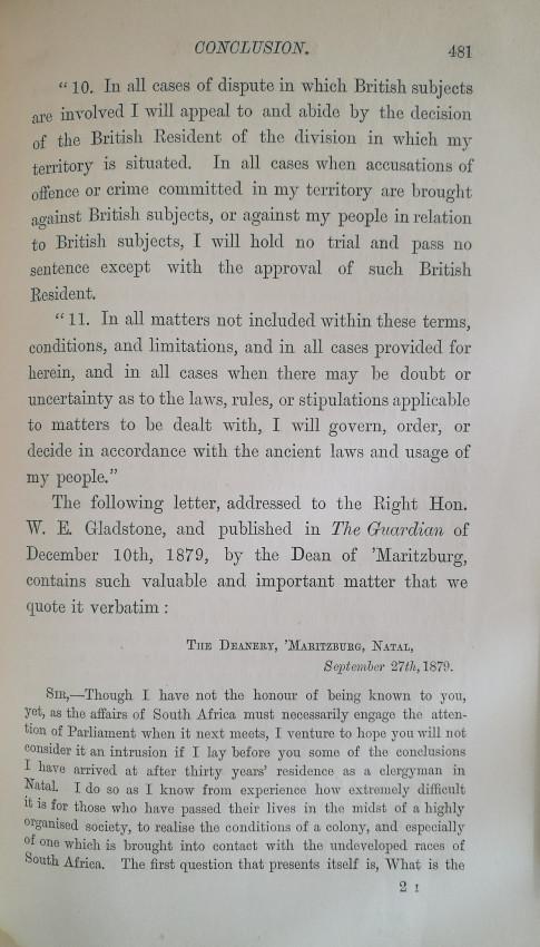 Frances, who lived in Natal for thirty years, is very clear - especially in her conclusion (see image) - that the instigation of the bad feeling and later actual attacks on the Zulus lay with the 22,000 whites and Governor Frere, and not with the 360,000 Zulus and their king, who were peaceful except when rustlers stole their cattle