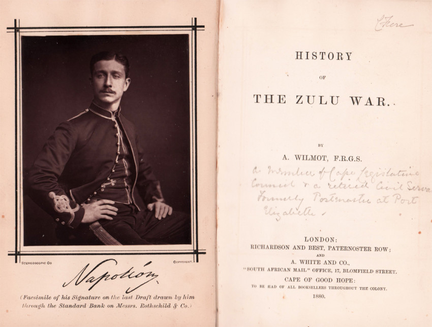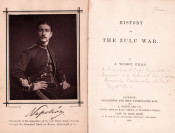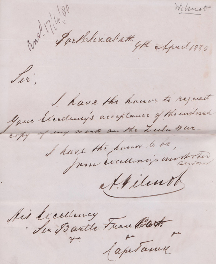 Letter pasted onto the front free end paper reads: Port Elizabeth 4th April 1880 To His Excellency Sir Bartle Free Sir, I have the honour to request Your Excellency's acceptance of the enclosed copy of my work on the Zulu War. Signed by A Wilmot