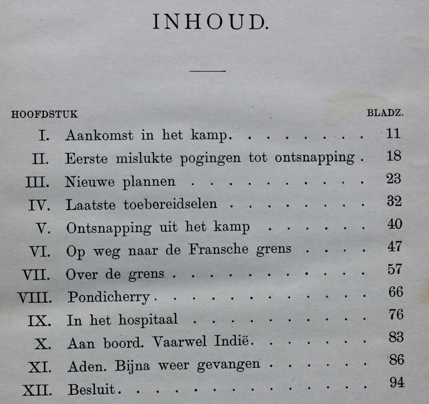 The author escaped from a Anglo-Boer War prisoner-of-war camp in Trichinopoly in South India, disguised as an Indian, into the nearby French enclave of Pondicherrry and thence by ship to France.