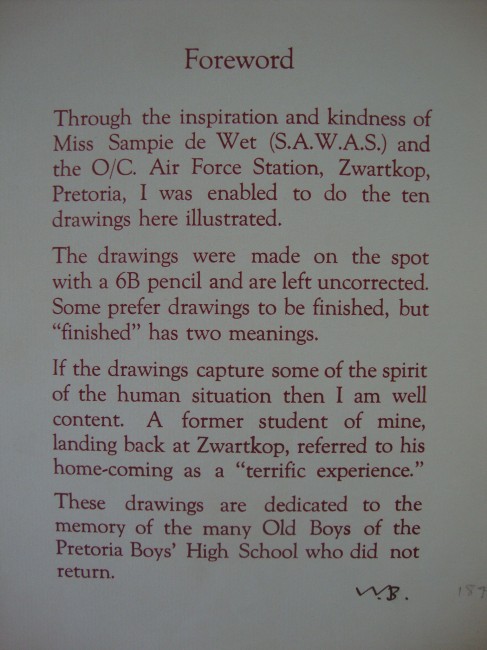 Unpaginated – title page one page foreword and 10 full-page drawings 12 leaves in all. The drawings are dedicated to the memory of Old Boys of the Pretoria Boys’ High School.