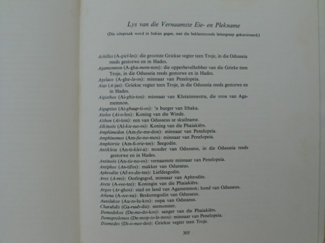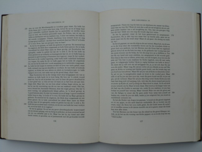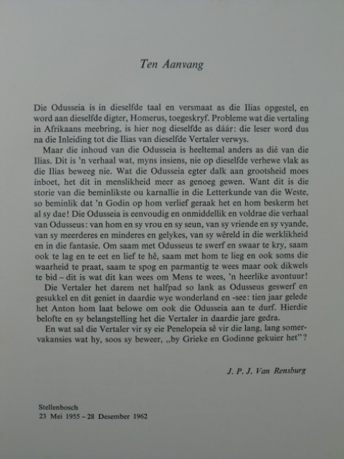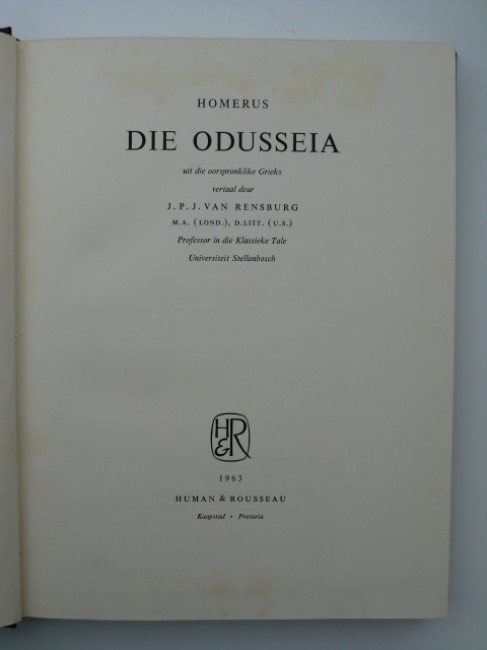 Homer's Odyssey in Afrikaans, translated by J.P.J.Van Rensburg, Professor in die Klassieke Tale, Universiteit Stellenbosch; 308pp. including list of names and place-names.