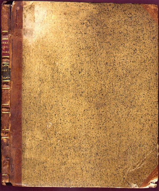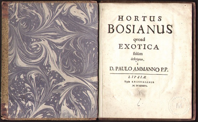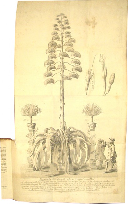 (xi), 38 pages, extra illustrated with two large engraved folding plates, one of the gardens of Kaspar Bose outside the Grimma Gate in Leipzig (360 x 645 mm) and the other is titled 'Eigentliche Abbildung der Americanschen Aloe (715 x 395 mm), small stamps removed from the title page and dedication leaf, small portion of the bottom margin of leave 26/27 & 27/28 torn away, some light browning, contemporary quarter leather with red and green title labels, sprinkled paper sides, edges of the spine worn with some loss of the labels, top and bottom of the spine and corners are worn and chipped, marbled front and rear paste-down endpapers, embossed private library stamp at the bottom corner of the title page.