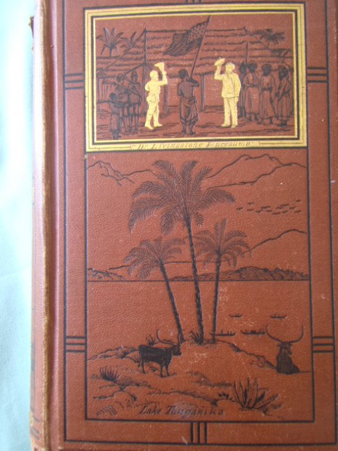 The bevelled terra-cotta cloth-boards are embossed on all faces - with black and gilt illustrations and rules on the upper panel and black and gilt lettering, a further illustration and rules on the spine. The main cover illustrations are the famous "Dr Livingstone I presume" and Lake Tanganyika.
