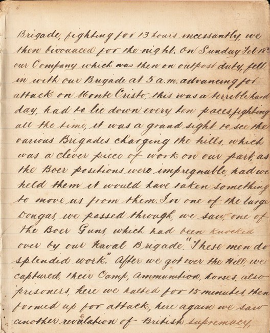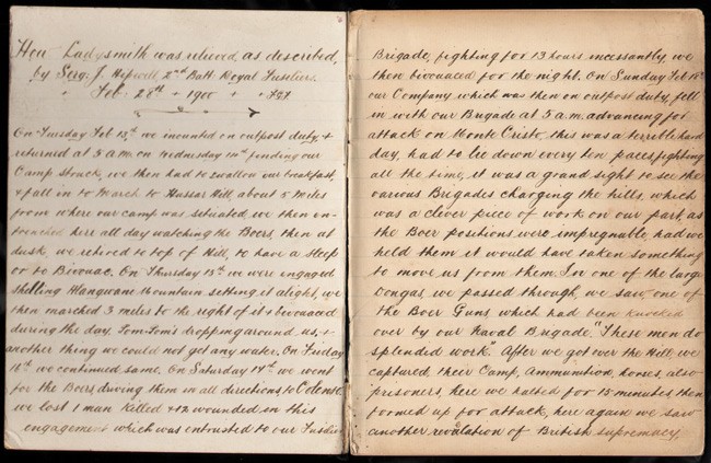 Eleven page diary account of events from Tuesday, 13th February to 6th March describing his involvement in engagements leading up to the relief of the town on 28th February.