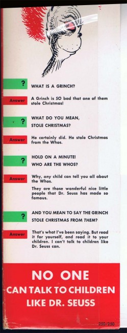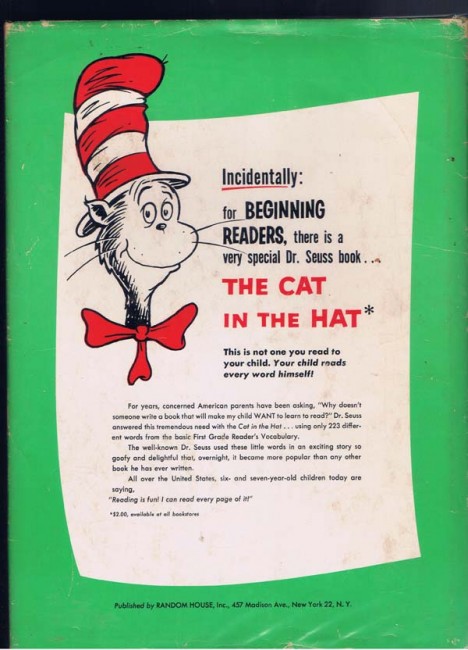 1st edition first printing with Cat In The Hat on back cover and 14 titles(up to now) listed on the rear dj flap, and a list of 13 titles at the end of the book. 250/250 price on dj front flap. On front decorated endpaper is an inscription that reads To Chris Merry Christmas 1957 Mommy. on the verso of that is the inscription signed by Dr. Seuss " for Chris with best wishes Dr. Seuss" light wear to the dj edges. and some light rubbing to the book corners. Otherwise an nice crisp book with no writing, tears or smudges