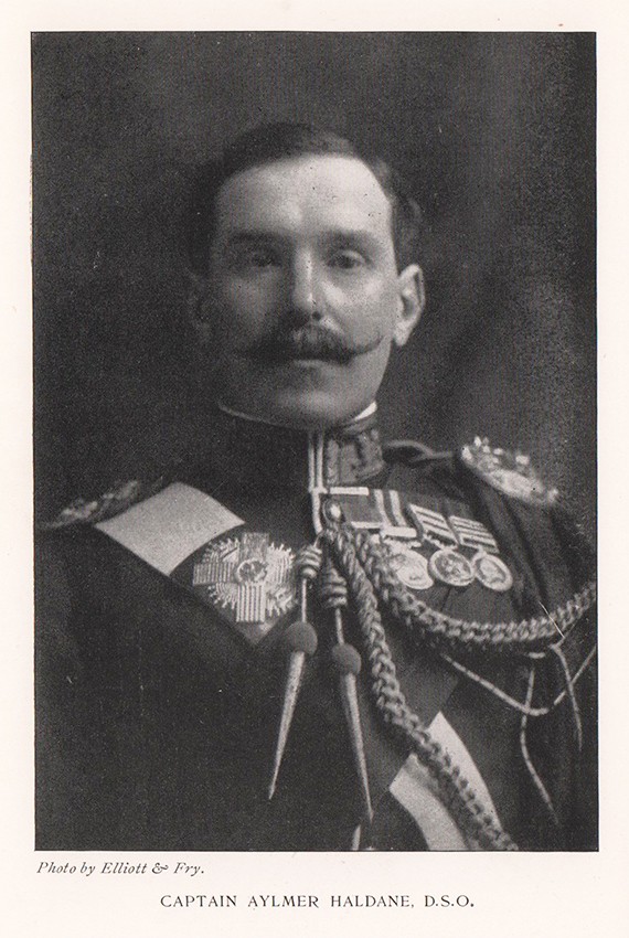 Revised edition: 231 pages, frontispiece of Captain Haldane, 1 folding map, 2 plans, 25 plates, pictorial brown cloth, titled gilt on the spine, an unusually good copy.