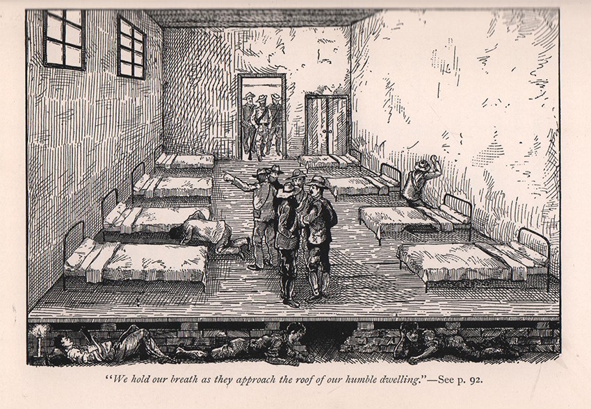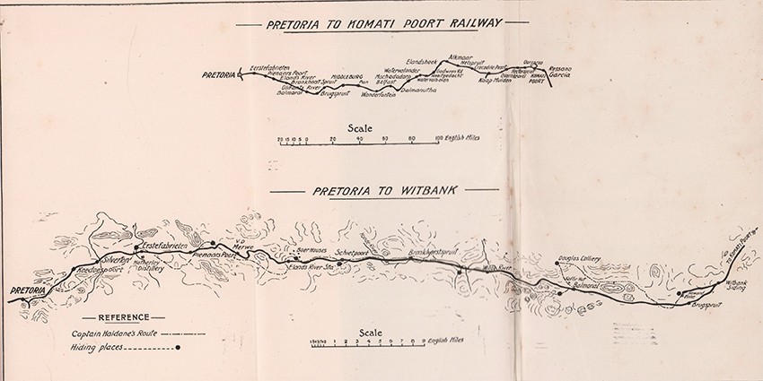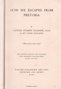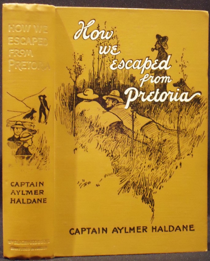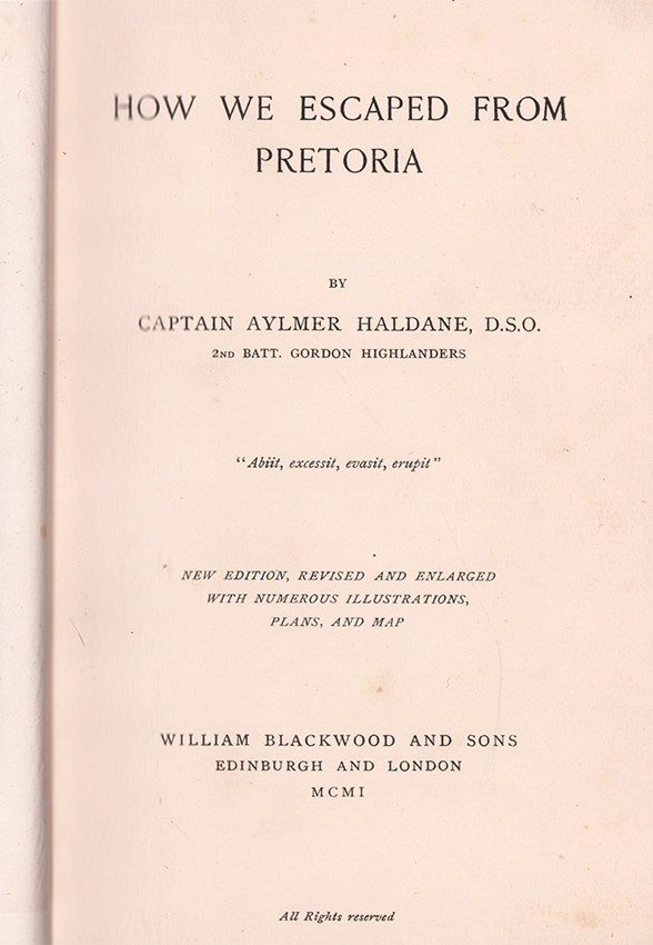 Mendelssohn (Sidney) South African Bibliography volume 1, page 669 - 670:After the battle of Elandslaagte, Captain Haldane, who had been wounded in the engagement, was sent to Pietermaritzburg to recoup ; in the meantime his regiment was shut up in Ladysmith. After his recovery he was attached to the Royal Dublin Fusiliers, and receiving orders to reconnoitre with a detachment on the armoured train, was attacked by the Boers, and captured, at the same time as Mr. Winston Churchill. The captives appear to have been kindly treated, and the author remarks, "Throughout the journey to the Boer metropolis we met with nothing but the greatest consideration." Nevertheless, he did not form an exalted opinion of "the pious, God-fearing Boers," and says, "These very men, who are almost as full of apt texts as the great Cromwell's Ironsides, are far from acting up to the religious sentiments they profess. The prisoners were taken to the Staats Model School at Pretoria, and Churchill, Brockie, and Haldane made many plans to escape, which were doomed to failure, but eventually Churchill got away on December 12th ; the others were observed by a sentry, and dared not make the attempt, but later on they managed to hide themselves under the floorings of the prison, and being joined by Le Mesurier, they disappeared on February 26, 1900, to the consternation and mystification of their guards, who never supposed they were hiding in the building. They were supplied with necessities from time to time by their fellow officers who were in the secret, but found no means of escape till March 16th, when all the prisoners were removed and the building deserted, when, finding the coast clear, they succeeded in getting outside, eluded the few passers by, and were soon on the veld. The officers were hidden by some friends amongst bales of wool, which were put on a truck attached to a passenger train bound for Delagoa Bay, which took them safely across the border.