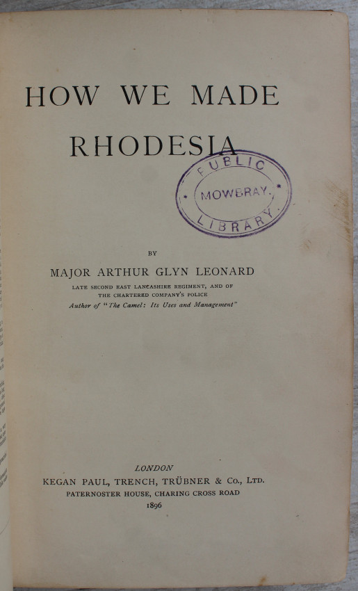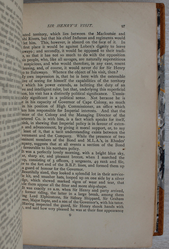 'The work takes the form of a series of letters, which includes the period from March 29, 1890, to November 23, 1891. On the former date the author received a cable from Sir F. Carrington offering him ""a troop in the Chartered Company's Police,"" which he accepted, leaving for South Africa a few days later, and reaching Cape Town on 23rd April. He was stationed for a considerable period at Macloutsie, where the force was inspected, first by General Methuen and later on by Sir Henry (afterwards Lord) Loch, then High Commissioner of South Africa. In December the troop marched to Tuli, where Major Leonard remained till he resigned his commission in September 1891. The author's digressions are numerous, ranging from discussions on ""Home Rule,"" to an essay on ""the duty of mankind to animals,"" and embracing his opinions on all kinds of subjects of a social, political, and philosophical nature. The writer also criticises the characters of the notabilities he encountered during his stay, amongst these being Messrs. Rhodes, Jameson, Beit, Rutherfoord Harris, Lord Randolph Churchill, Theodore Bent, and many others. He is very severe on Dr. Rutherfoord Harris, alluding to his ""bumptiousness and ignorance,"" and he expresses surprise at ""Rhodes putting a man of his stamp in such a responsible position."" He had, however, great admiration for both Rhodes and Jameson, who, he asserts, ""are imbued with the same identical line of thought and ideas, while the selfsame fiery spirit of unbounded ambition inspires them.""' -(Mendelssohn Vol. I, page 887)