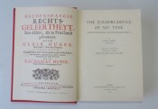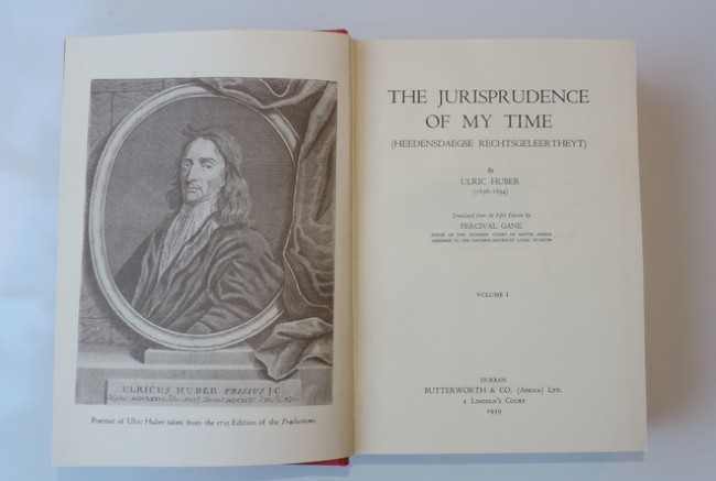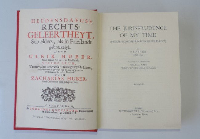 Heedendaegse Rechtsgeleertheyt. Translated from the Fifth Edition by Pervical Gane, Judge of the Supreme Court of South Africa Assigned to the Eastern District’s Local Division. In Two Volumes. Bound in red book cloth with gold lettering on spine. Binding firm and in excellent condition. Previous owner’s name penned on the inside front cover of Volume 1. Contents clear and unmarked.