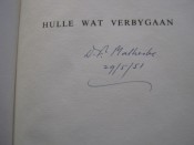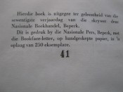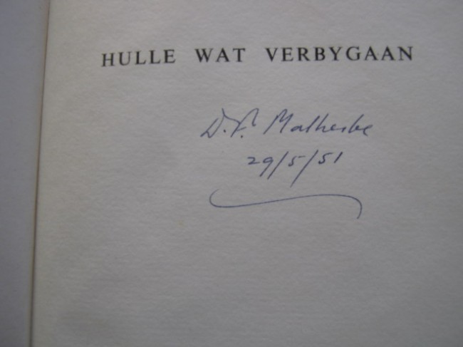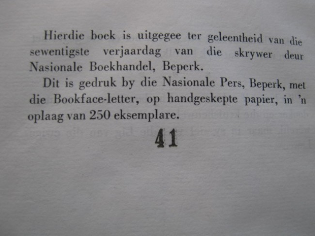This little book - green cloth-boards, gilt to the panel only, plain endpapers and 24 pp of text on handmade paper from J Dickinson and Co of England, leaves rough cut - was published to mark this distinguished Afrikaans author\'s seventieth birthday. The copies were signed by him on 29 May 1951, the day before his birthday.