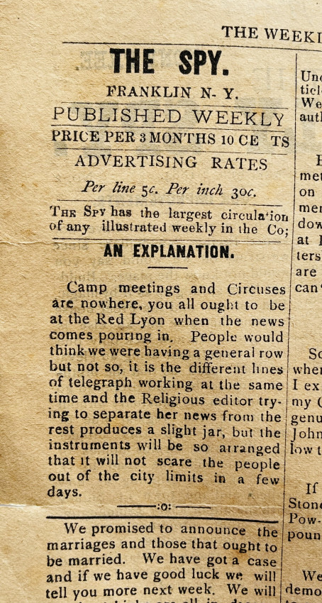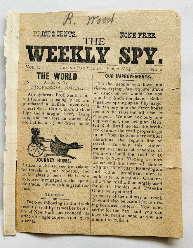 HUMOR: Amateur Newspaper. The Weekly Spy; Frying Pan Square, Vol. 1, No. 2. ( Franklin, N.Y. ); Feb. 2, 1884. 4 p., illustrations, ads.