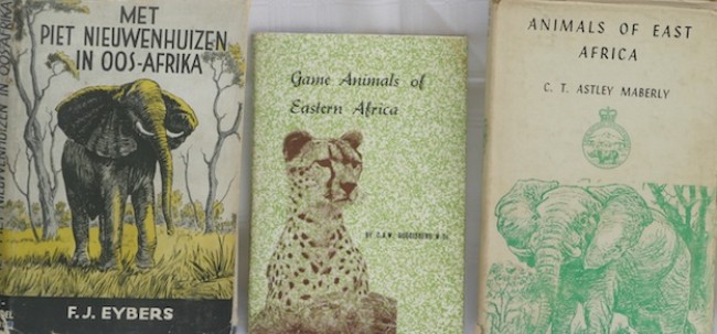 1) Animals of East Africa by C.T. Astley Maberly (published by Howard Timmins of Cape Town for the Royal National Parks of Kenya), second edition 1960, hard cover, pp. 211. A Good+ copy in a Fair dust jacket; 2) Game Animals of Eastern Africa by C.A.W. Guggisberg, Patwa News Agency, Nairobi, revised edition, 1959, hard cover, pp. 64, a Good-Very Good copy; 3) Met Piet Nieuwenhuizen in Oos-Afrika by F.J. Eybers, Unie-Boekhandel, Pretoria, 1947. Originally published in Dutch. Hard cover, pp. 252. A Fair ex-library copy in a Fair dust jacket.