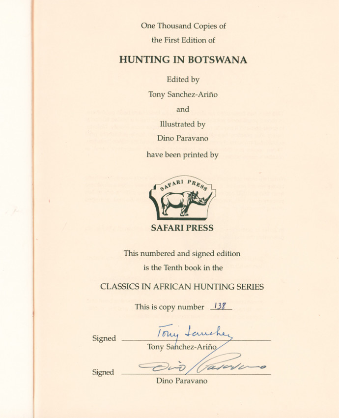 The limitations page reads: One thousand copies of the first edition have been printed. This numbered and signed edition is the tenth book in the Classics in African Hunting Series. This is copy number 138 signed by the author and the illustrator.