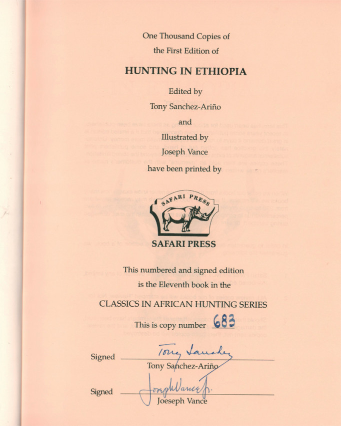 The limitations page reads: One thousand copies of the first edition have been printed. This numbered and signed edition is the eleventh book in the Classics in African Hunting Series. This is copy number 683 signed by the author and the illustrator.