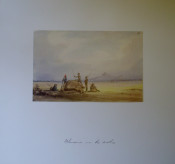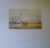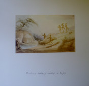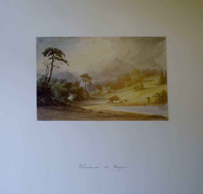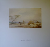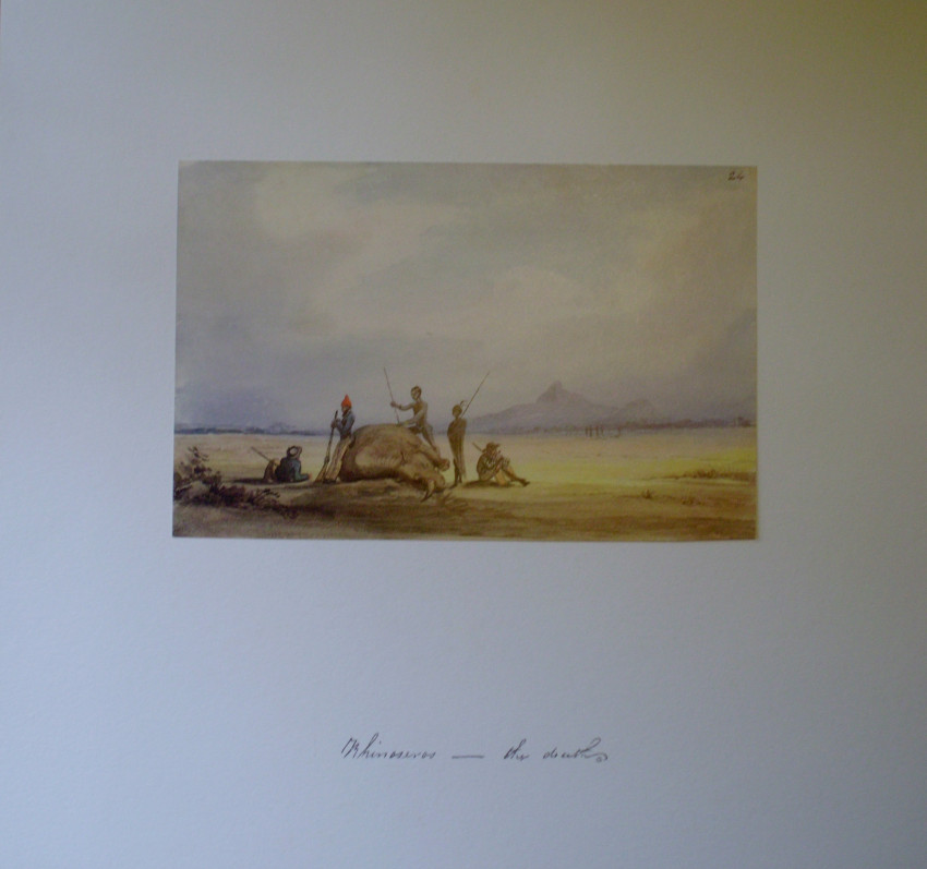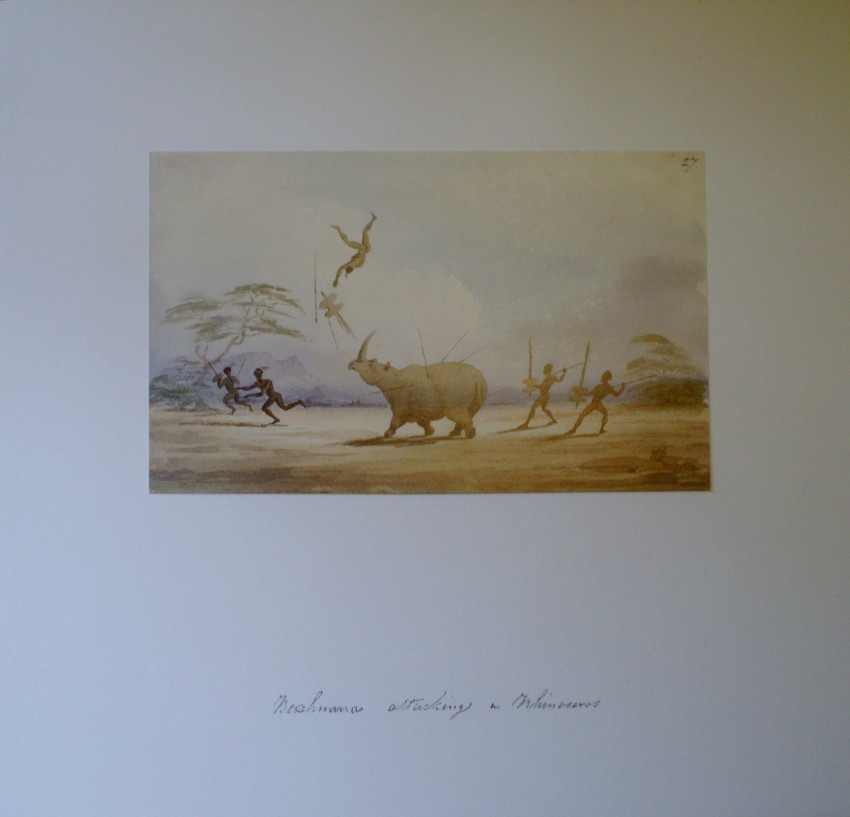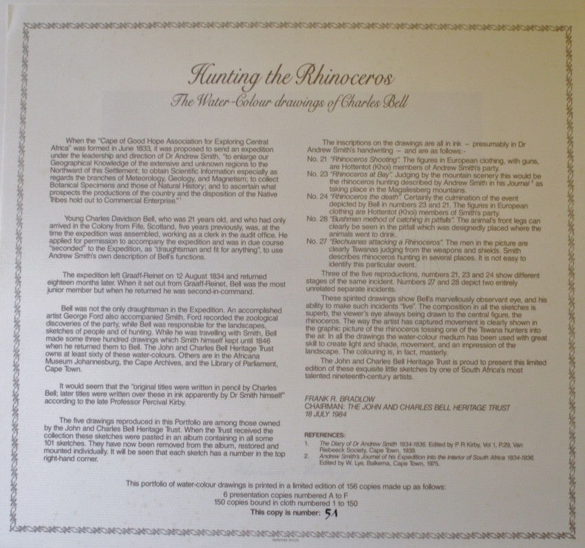 Cloth Folder with 5 prints, the inscriptions on the drawings are all in ink, presumably in Dr. Andrew Smith's handwriting, Titled as follows., No. 21 "Rhinoceros Shooting" The figures in European clothing , with guns, are Hottentot members of Andrew Smith's party. No. 23 "Rhinoceros at Bay" Judging by the mountain scenery this would be the rhinoceros hunting described by Andrew Smith in his Journal as taking place in Magaliesberg mountains. No. 24 " Rhinoceros the death ". Certainly the culmination of the event depicted by Bell in numbers 23 and 21. The figures in European clothing are Hottentot members of Andrew Smith's party. No. 28 " Bushmen method of catching in pitfall which was designedly placed where the animals went to drink. No. 27 " Bechuanas attacking a Rhinoceros ". The men in the picture are clearly Tswanas judging from the weapons and shields.