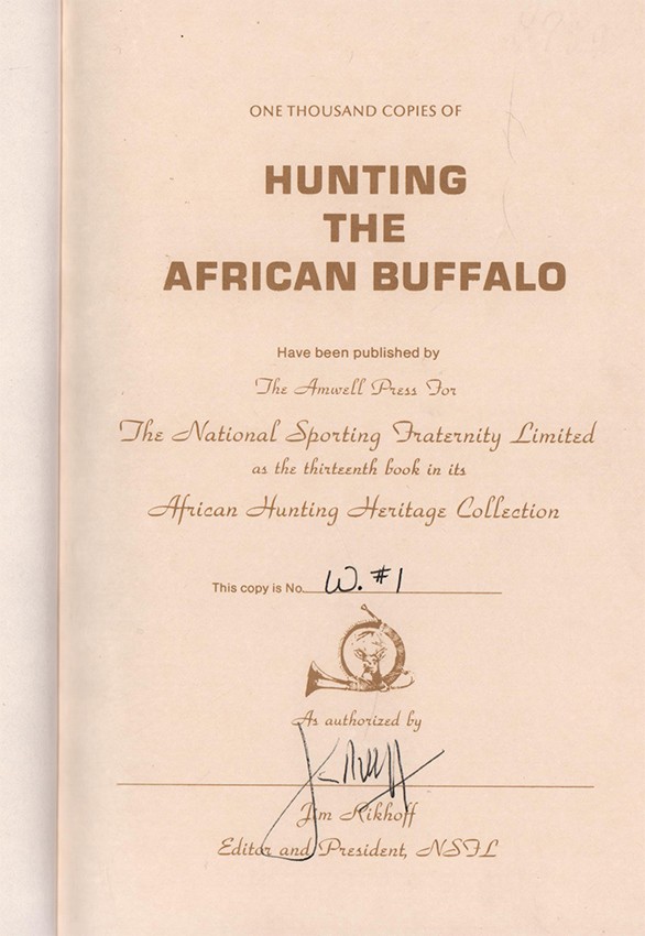 Limitations page reads: One thousand copies have been published by the Amwell Press for the National Sporting Fraternity Limited as the thirteenth book in its African Hunting Heritage Collection. This is copy no.W.# 1 as authorised by the editor and president of NFSL