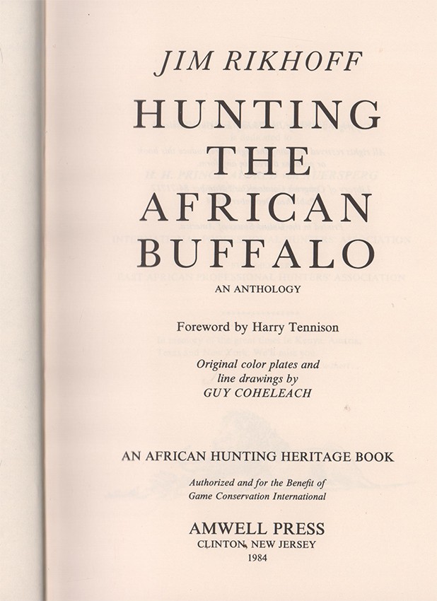 Czech (Kenneth) An Annotated Bibliography of African Big Game Hunting Books 1785 -1999, page 232: A compendium of buffalo hunting stories gathered from all regions of the continent including excerpts from previously published books by Foran, Selous, Roosevelt Jack O'Connor etc. Of more original interest are the pieces supplied by Tiny Dyer, Dougie Collins, Bunny Allen and other more recent hunters.