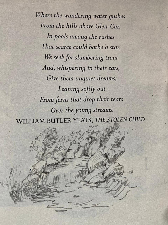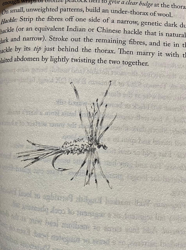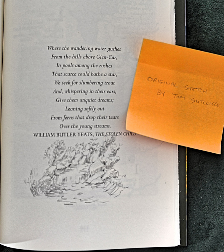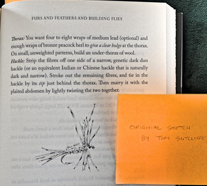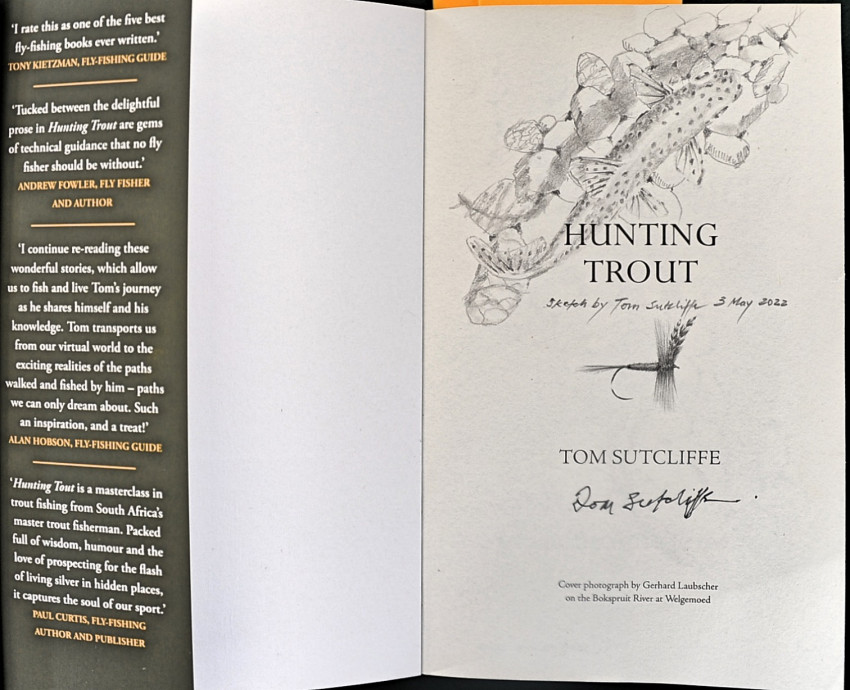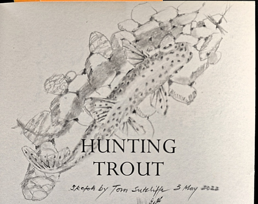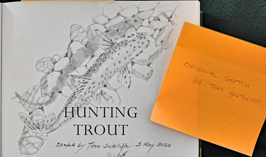 The author, Dr. Tom Sutcliffe has included three hand-drawn sketches in this copy, one on the title page of a trout in suspension over a bed of pebbles, another of a DDD fly and a third sketch of a typical trout stream scene. The hand drawn title page sketch is inscribed 'sketch by Tom Sutcliffe 5 May 2022'. He has also signed under his name on the same page.