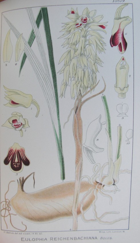 This work was followed in 1893 by the first volume of his Icones orchidearum Austro-Africanarum extra-tropicarum. Although he worked on two volumes, the second did not appear until just after his death in 1911. A third volume was edited and completed by Miss H. M. L. Kensit, with nine extra plates painted by his son, Frank Bolus (1870-1945), and published in London in 1913." - DSAB I, p. 90.
