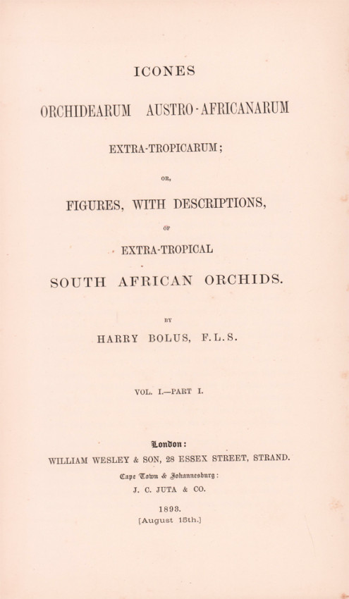 Bolus paid for the publication of this work himself. The plates were lithographed on stone, adding considerably to the expense. As a result he scrimped on the bindings which are often in need of the binder's attention although not in this case. Only 250 sets were published of which half were sold to the public. Volume 1 is either found in two separate parts, as here, or with the two parts bound in a single volume.