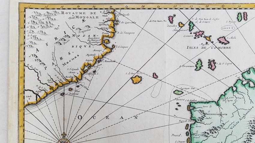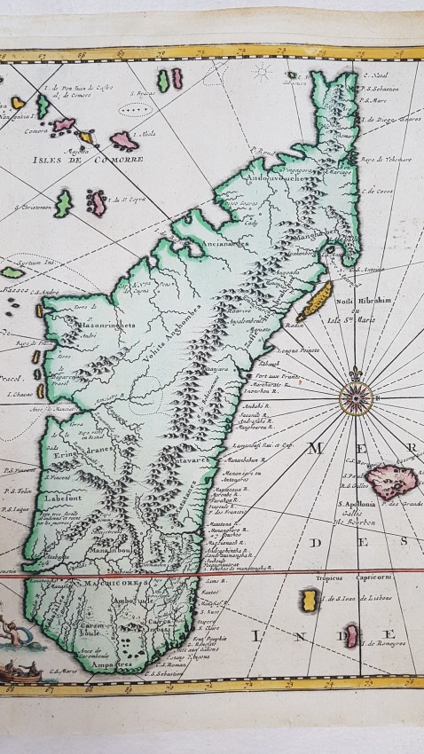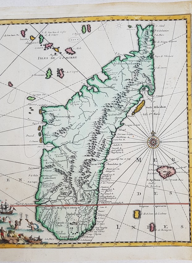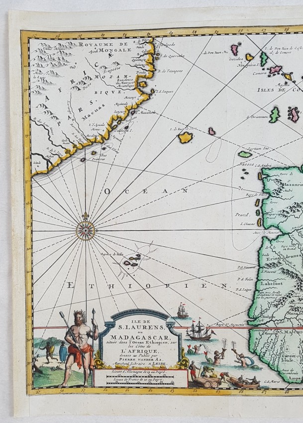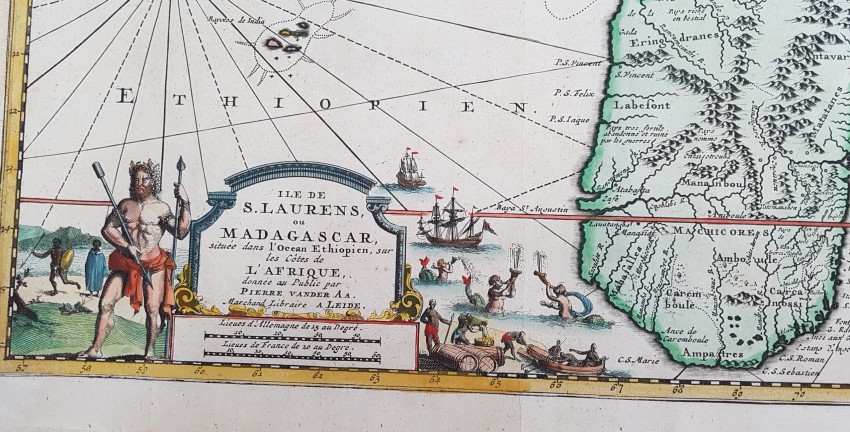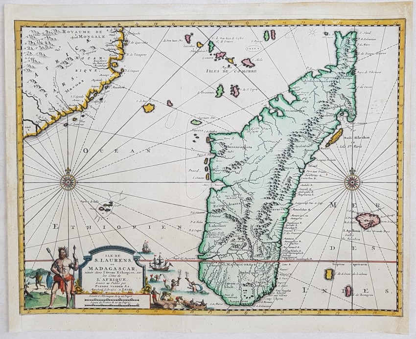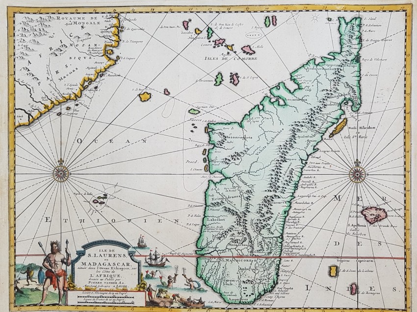 Map of Madagascar and Reunion of 1719 by Pieter Van Der Aa coloured by hand. Very beautiful cartouche in the lower side.