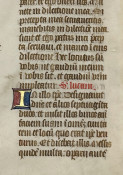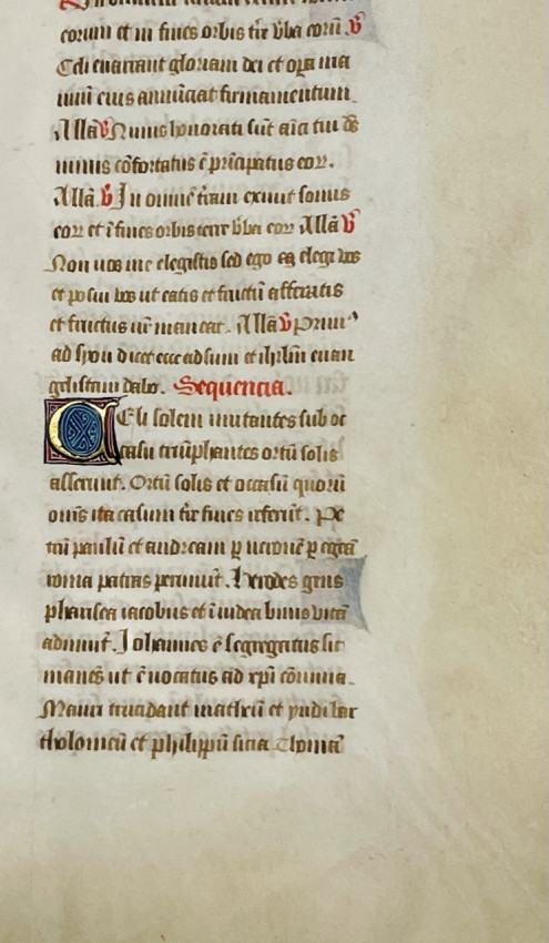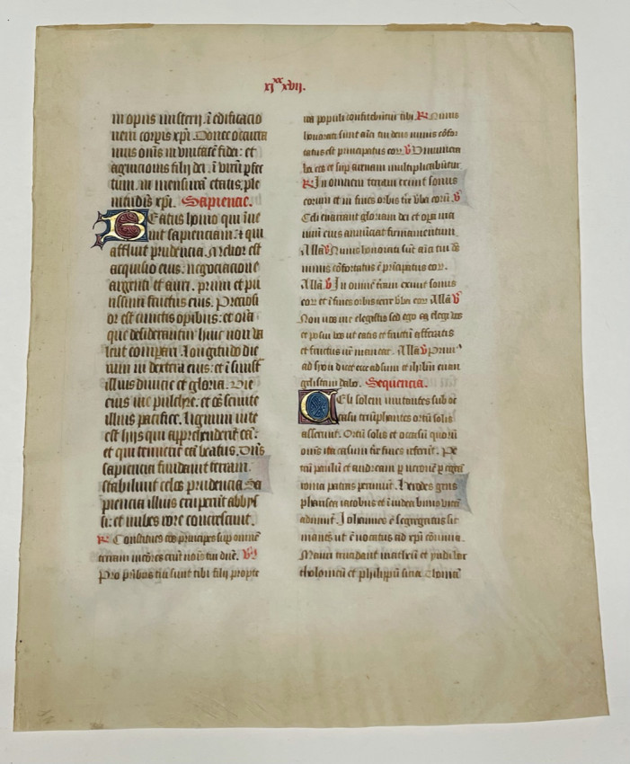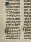 An unidentified manuscript leaf on vellum with gothic inscriptions in brown and red ink, and 5 decorative initials in gold, red and blue; Sheet size: Approx. 12.5 x 10 inches.