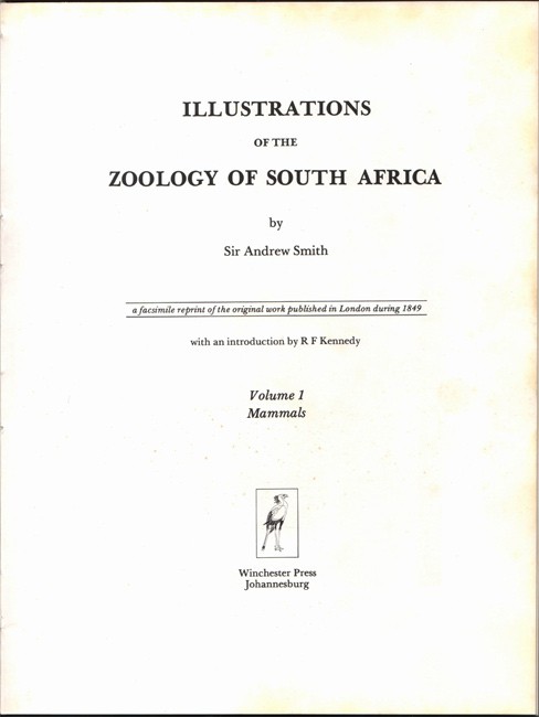 Kirby (P.) Sir Andrew Smith's Zoology, A re-examination of the facts relating to its publications. Africana Notes & News, volume II, no. I. December 1944, pages 3-15. 'Andrew Smith from the moment of his arrival in South Africa in 1821, interested himself in the natural history of the sub-continent. He began immediately to collect and to preserve specimens, and to publish descriptions of them wherever possible, both in South Africa and overseas. He founded the South African Museum in June, 1825, and issued the first part of a descriptive catalogue of some of the contents in 1826. He published in "The South African Commercial Advertiser" a series of articles which were intended to give in outline the zoology of South Africa, and he was the leading spirit in the founding of the first scientific paper to be published in the country, "The South African Quarterly Journal", to which he contributed many valuable ornithological notes. He went on quite a number of scientific expeditions during his stay in South Africa, but it was his great expedition of 1834-1836 that supplied the bulk of the material for his classic work on South African Zoology.' A prospectus was issued for the publication. 'The Work will appear in periodical parts, price ten shillings each; and it is estimated that it will be completed in about thirty-four parts. As it will be necessary that the plates be published promiscuously, they will be arranged in five divisions, viz., MAMMALIA, AVES, PISCES, REPTILIA and INVERTEBRATAE. The plates of each of these divisions will be numbered independently, and the letter-press descriptions left unpaginated, so that on the work being completed, they may be arranged either agreeably to the general classified order which will accompany the last number or according to the particular views of the purchaser.'