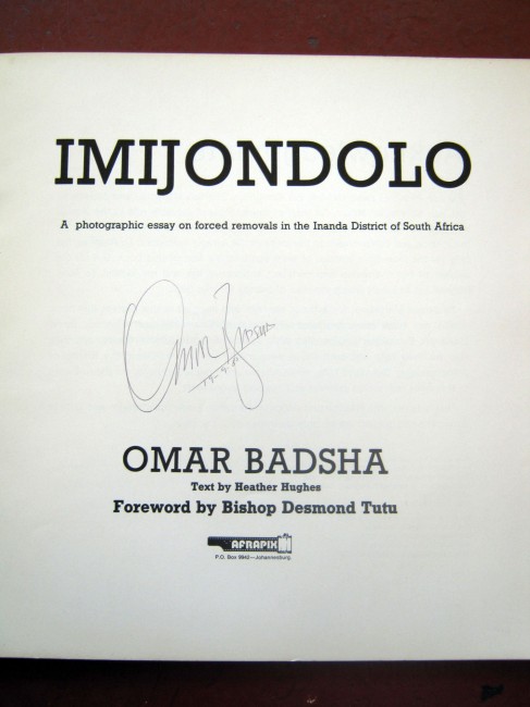 Text by Heather Hughes, Foreword by Bishop Desmond Tutu. Signed by Omar Badsha on title page. 78p. Imijondolo is the Zulu word for the houses built from any material, characteristic of townships and informal settlements in South Africa. These pictures were taken over a period of three years in Inanda. Minor wear to spine and corners.
