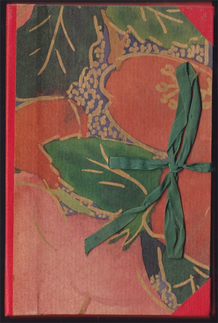 Unpaginated (20 pages), original brown card wrappers with a paper title label on the upper cover, binding sewn with thread, edges uncut, preserved in a fold-down case with a ribbon tie. Small stain at the top corner of the title page.
