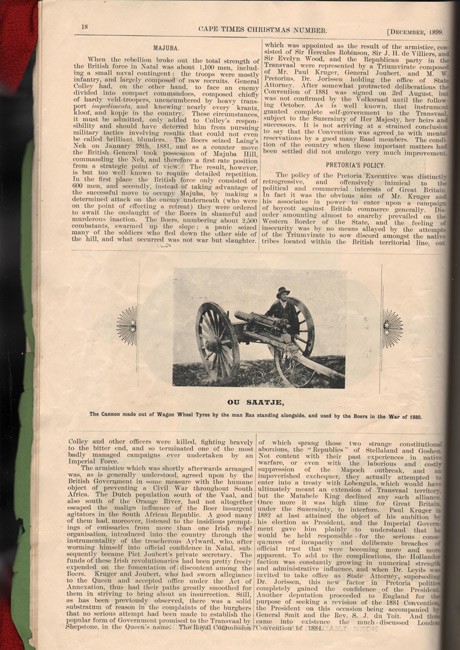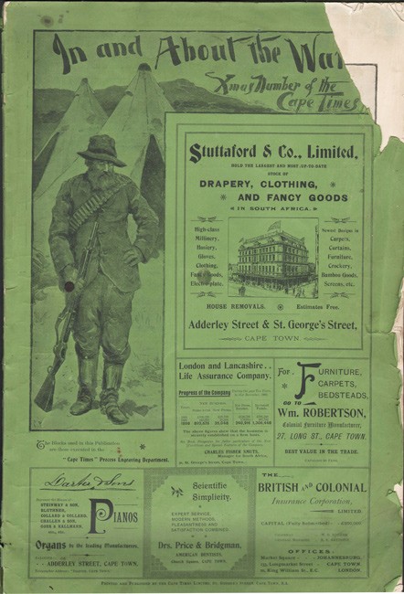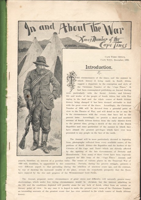 ‘The circumstances of the times, and the manner in which history is being made in South Africa, suggest a departure in the conception and style of the Christmas Number of the “Cape Times.” It had been contemplated publishing an Annual dealing more particularly with the Social, Artistic, and Literary life and works of the peoples of South Africa, but with War raging in the land and the whole course of South Africa history being changed it has been deemed advisable to deal with the great events of the times. Accordingly, the Christmas Number of 1899 will be devoted from a pictorial point of view to the Theatre of War, and will detail as far as may be in the circumstances with the events that have led to the present issue. Accordingly, we present a short and succinct account of South African history from the early thirties down to the present time, giving a sketch of the rise of the Dutch Republics and some particulars of the manner in which they have abused the greatest privileges which have even presented to any people on the face of the earth.’ From the Introduction.