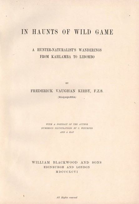 Czech: An annotated Bibliography of African Big Game hunting Books, 1785 to 1950, page 89, ‘One of the classics of African sport, this book describes the author’s hunting experiences in Portuguese east Africa and the eastern Transvaal. He relates hunting in the rugged Kloof country after bushbuck, kudu, and leopard. In the Khalamba foothills, he bagged buffalo, but was quick to blame the Boer Transvaal government for the decline in game numbers. He also hunted sable, giraffe, and wildebeest. Two long chapters on lion hunting are also featured. Complementing the text are excellent illustrations by Charles Whymper.’