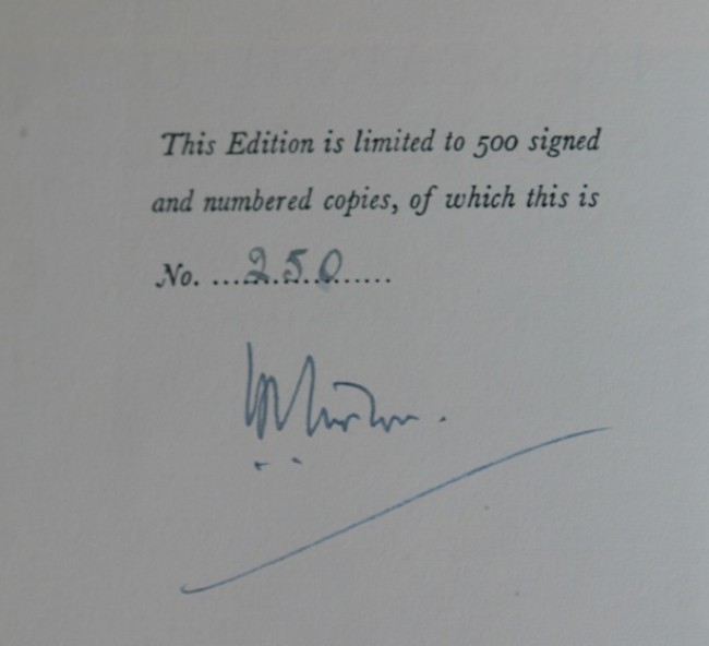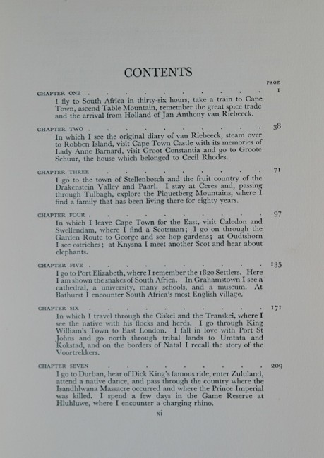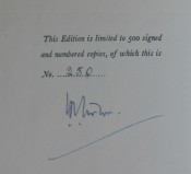 Travelling in and assessing South Africa in 1948. No. 250 of 500 LIMITED and SIGNED copies. pp. [xiii] frontis., prelims + 368 text, index + colour illustrations (unpaginated). Blue cloth boards, gilt decoration to front board, gilt titling on red title label to spine. Upper text block edge gilt, fore edge shows some foxing. Maps on endpapers. Slight water damage to fore edge of frontis. Internally a clean copy.