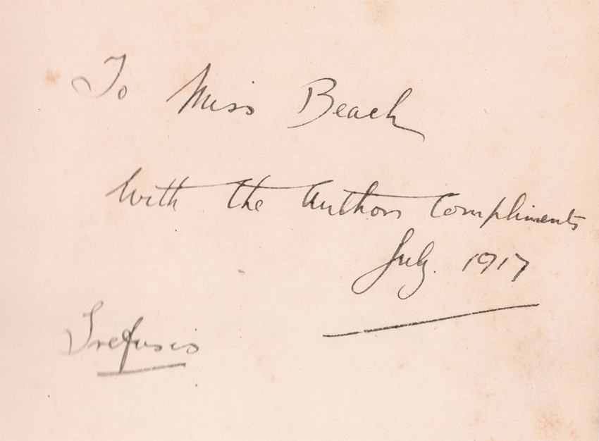 Inscription on the front free end paper reads: To Miss Beach With the author's compliments July 1917. Trefusis