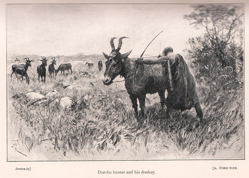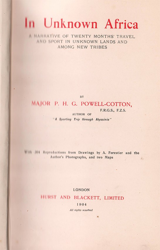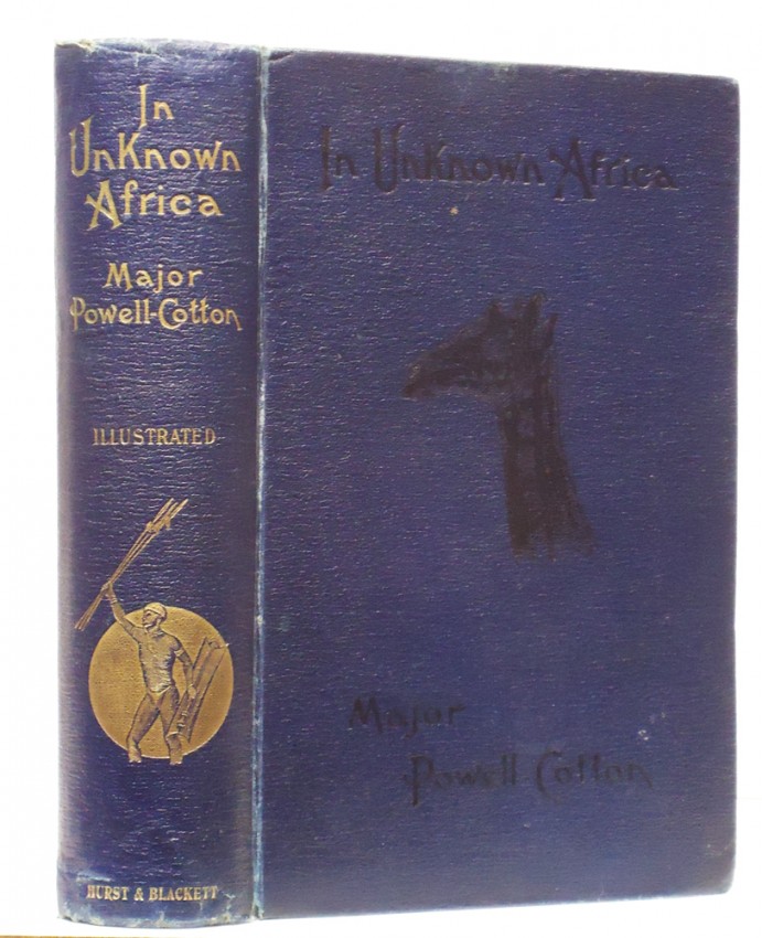Czech (Dr. Kenneth) An Annotated Bibliography of African Big Game Hunting Books 1785 – 1999, page 226: After the success of his sporting trip to Abyssinia, Powell-Cotton was determined to attempt another hunting expedition, this time to British East Africa, not only for sport but also to prove the existence of five-horned giraffe which Sir Harry Johnston had discovered. accompanied by shooting companion F. Cecil Cobb, the author proceeded to the Athi River where he bagged impala, rhinoceros and lion. Crossing the Tana, they spent time with the Kikuyu, then successfully hunted elephant. On the Baringo Plain, trophy kudu was collected as was lion. Powell-Cotton eventually bagged a five-horned giraffe before entering Masai territory where he hunted lion and rhinoceros as well as plains game. additionally elephant were taken after crossing the Etakatok River. Near Nt. Elgon, more lion and elephant were bagged. Additional hunts after hippopotamus and a variety of plains game continued and they approached the Nile.