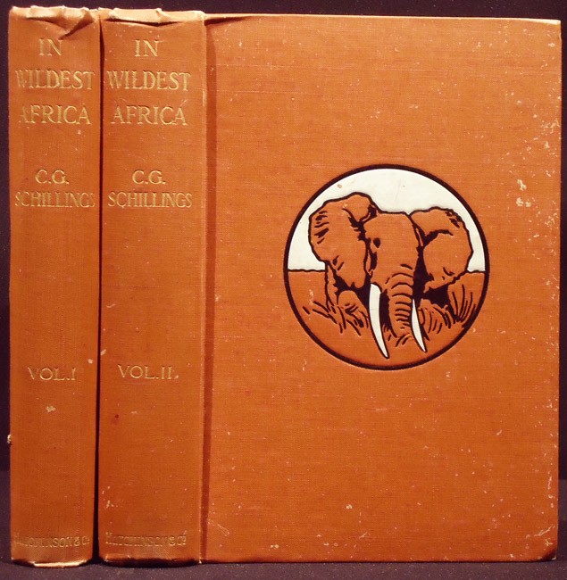 Czech: An annotated Bibliography of African Big Game hunting Books, 1785 to 1999, pages 247/8. ‘In his second work on photographing and hunting game in East Africa, Schillings captures the essence of the African landscape and its peoples with his brilliant, early snapshots. The first volume concerns a general view of the region, with a brief history of the encroachment of civilisation on the African wild, and an interesting if oddly placed chapter on sport and nature in Germany. Volume two includes chapters on hunting elephant, rhinoceros and lion, with additional sport after leopard, eland and other antelope. There is a remarkable photograph of the extraordinary pair of elephant tusks wighing a combined 450 pounds!’
