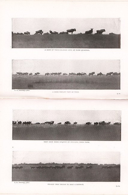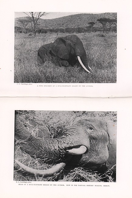 Czech (Kenneth) AN ANNOTATED BIBLIOGRAPHY OF AFRICAN BIG GAME HUNTING BOOKS 1785 -1999 Page 247: In his second work on photographing and hunting game in East Africa, Schillings captures the essence of the African landscape and its people with his brilliant, early snapshots. The first volume concerns a general view of the region, with a brief history of the encroachment of civilization on the African wild and an interesting, if oddly placed chapter on sport and nature in Germany. Volume two includes chapters on hunting elephant, rhino, and lion with additional sport after leopard, eland and other antelope. There is a remarkable photograph of the extraordinary pair of elephant tusks weighing a combined 450 pounds.