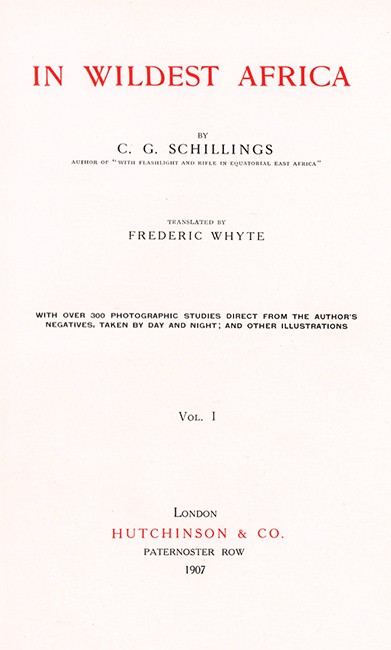 Czech (Dr. Kenneth) An Annotated Bibliography of African Big Game Hunting Books 1785 - 1999, page 247: In his second work on photographing and hunting game in East Africa, Schillings captures the essence of the African landscape and its people with his brilliant, early snapshots. The first volume concerns a general view of the region, with a brief history of the encroachment of civilization on the African wild and an interesting, if oddly placed chapter on sport and nature in Germany. Volume two includes chapters on hunting elephant, rhino, and lion with additional sport after leopard, eland and other antelope. There is a remarkable photograph of the extraordinary pair of elephant tusks weighing a combined 450 pounds.