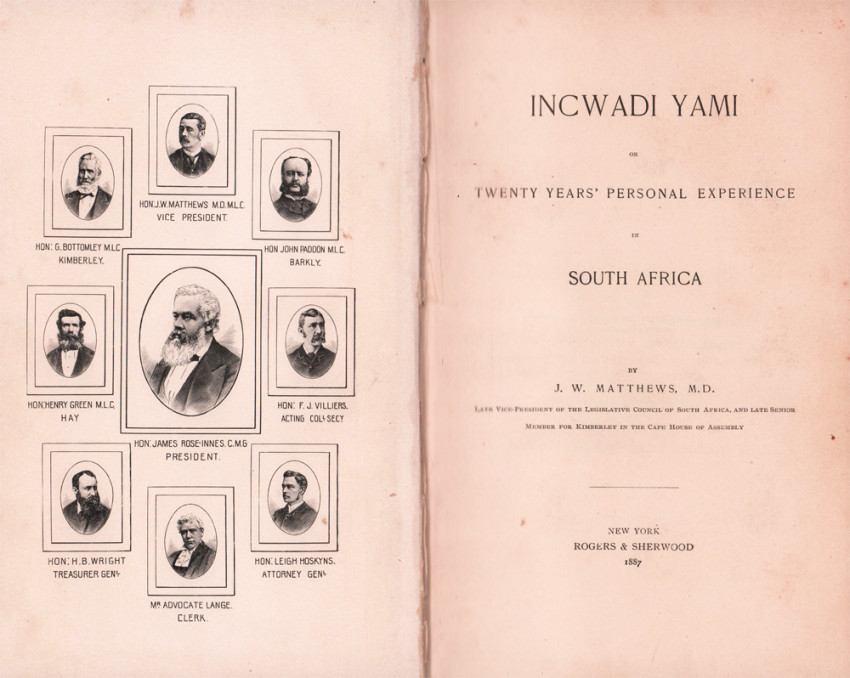 Mendelssohn (Sidney) South African Bibliography Volume 1 page 997:The author left England in 1864, having been appointed Surgeon to the Tugela, bound for Port Natal with emigrants, and on his arrival in South Africa he succeeded in obtaining the post of District Surgeon to Victoria Country (Natal). Dr. Matthews proceeded to the diamond fields in 1871; he had already sent up a party to work in the mines, in charge of Mr. G. J. Lee, afterwards Chairman of the Kimberley Mining Board, a gentleman well known as an expert geologist. The author was for many years closely identified with every social and political movement on the fields, and his description of the diamond fields, and his references to the " Illicit Diamond Trade," are particularly interesting. There are particulars of “The Kimberley Company and Share Mania of r88r," " The early History of the Diamond Fields," “An account of the Black Flag Riot," together with sketches of the author's adventures in Basutoland, Swaziland, and the Transvaal, where he eventually settled.