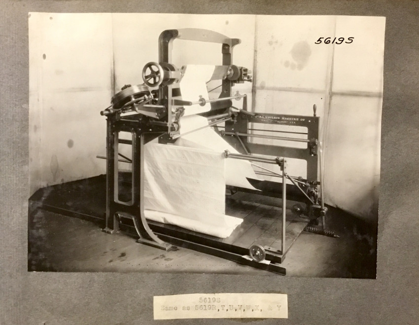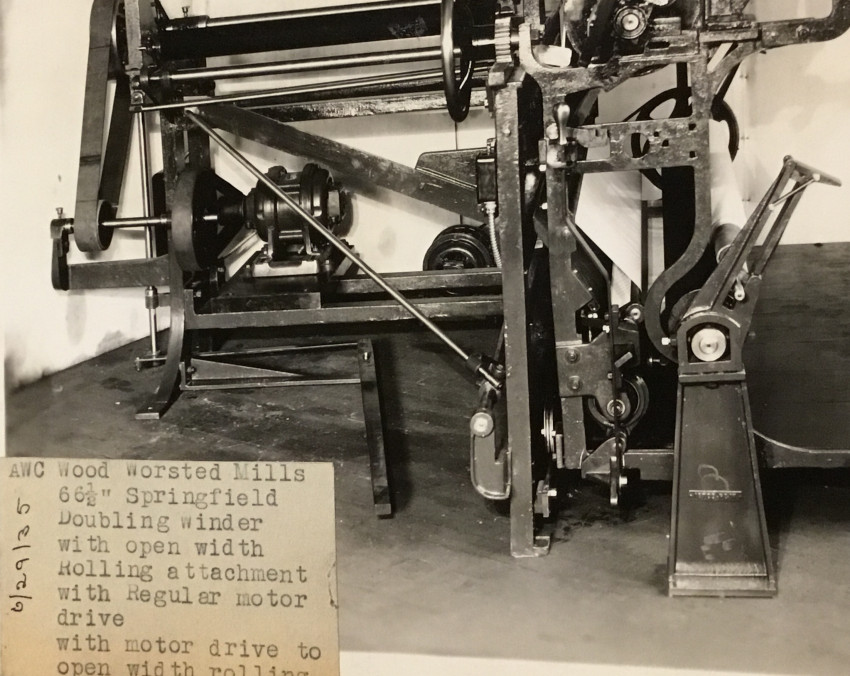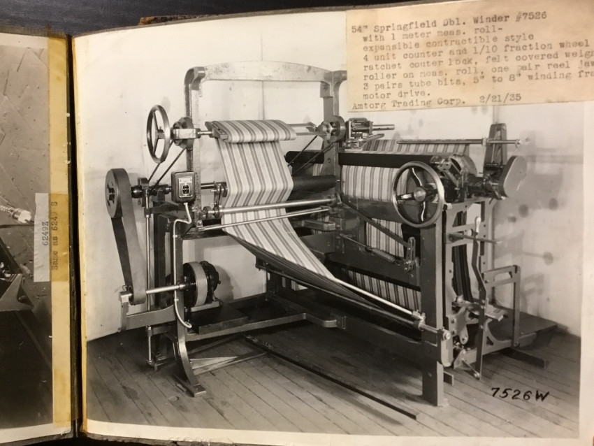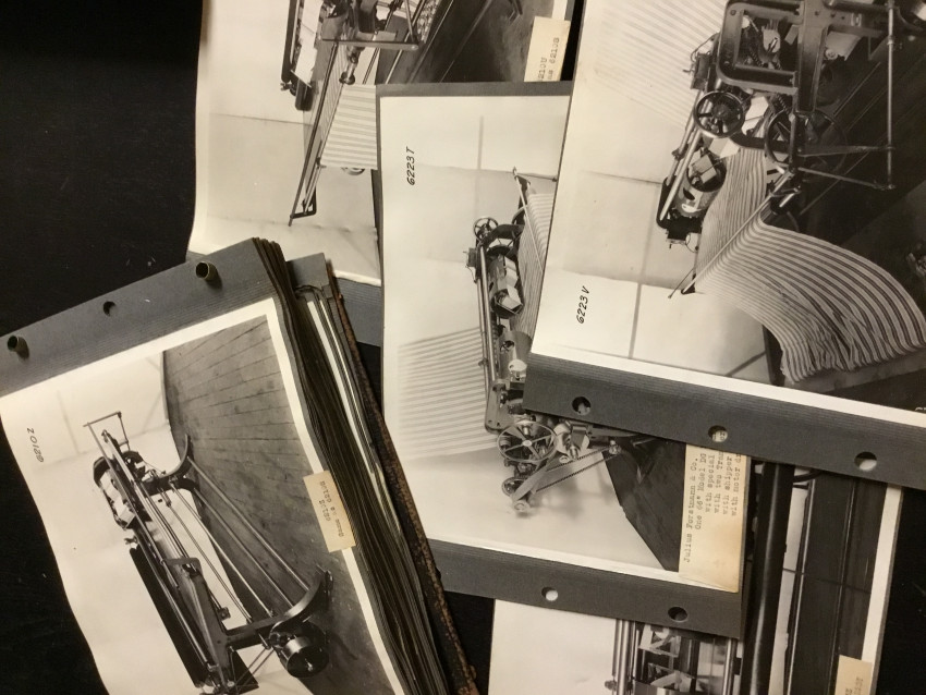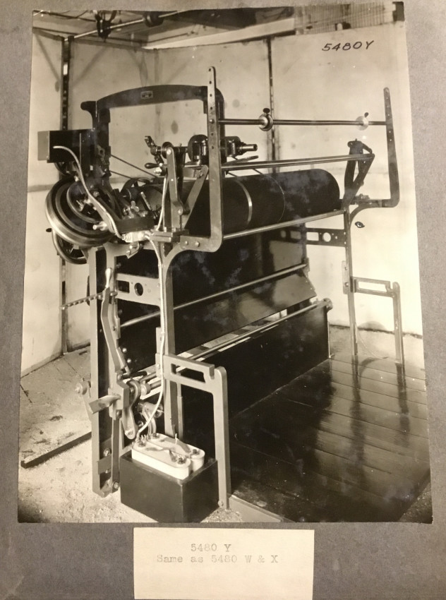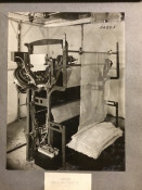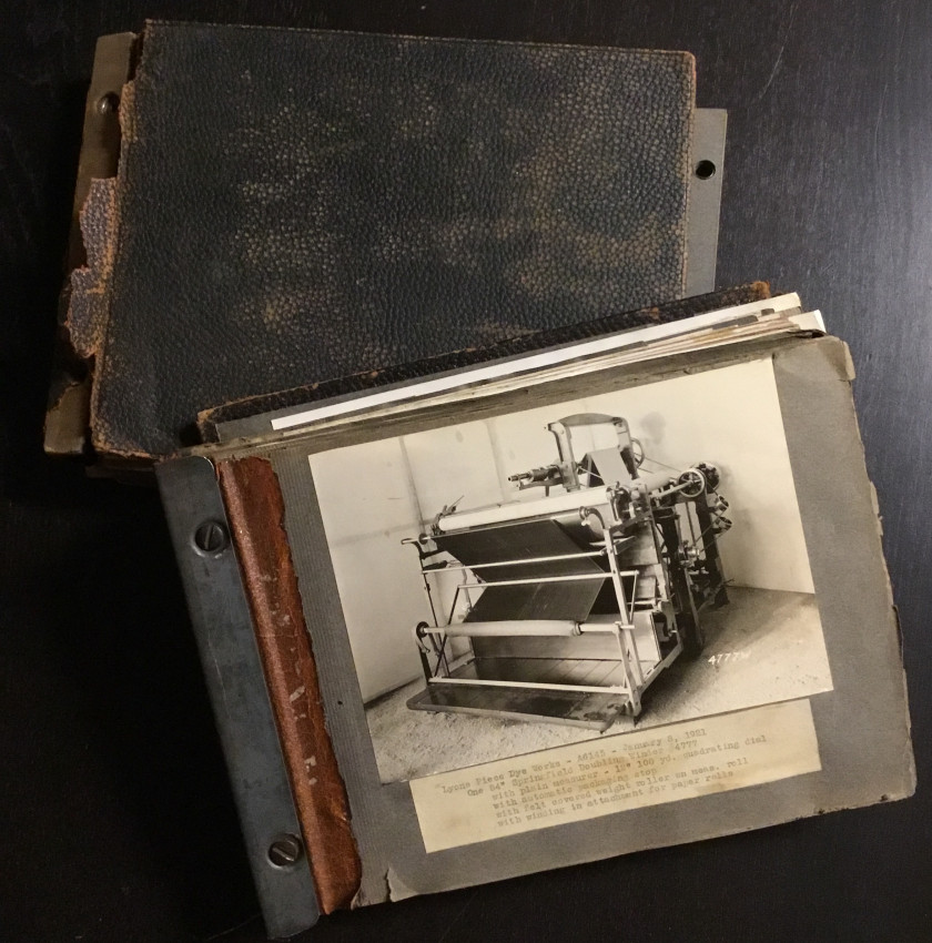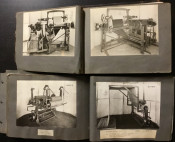 2 albums containing over 200 images of textile machinery ca. 1920s, presumably Massachusetts and nearby. Companies mentioned include W. S. Libbey, Monson Worsted, Lyons Piece Dye Works, Stehli Silks Corp., Expert Cloth Sponging, Packard Mills, Whittenton Mf'g Co., Michaels-Stern & Co., etc. All approx 8 x 10 inch silver prints with stock numbers in negatives, all mounted, a few coming loose from mounts, albums in poor condition, some photographs loose, covers detached; photographs generally very good.