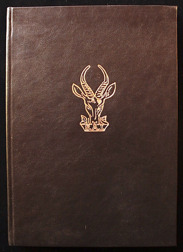 Imitation black leather binding with silver embossed Springbok emblem of the South African Infantry on front panel and silver titles on spine.