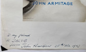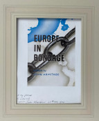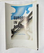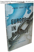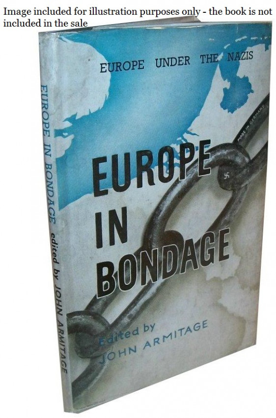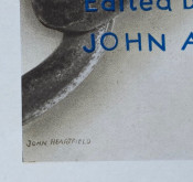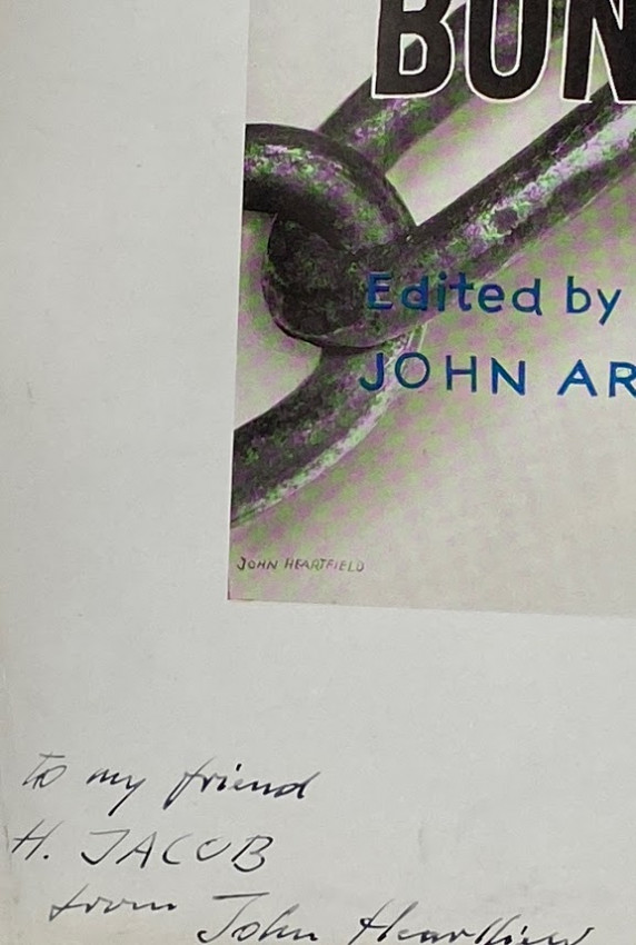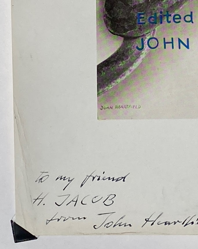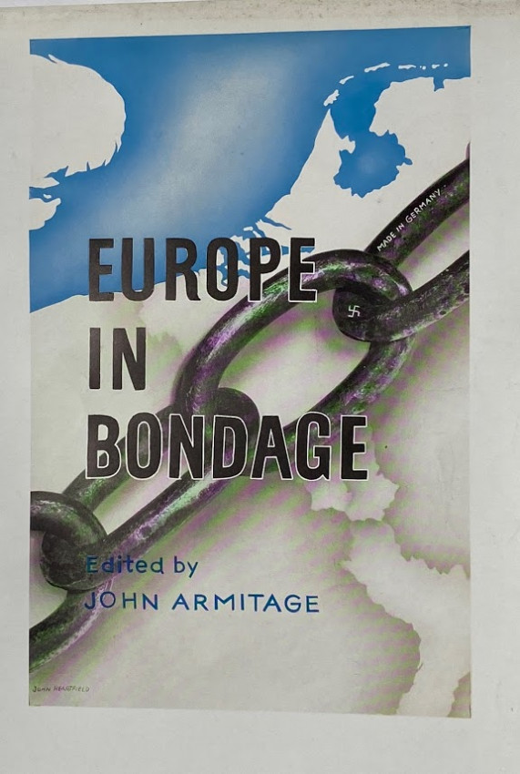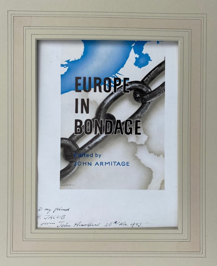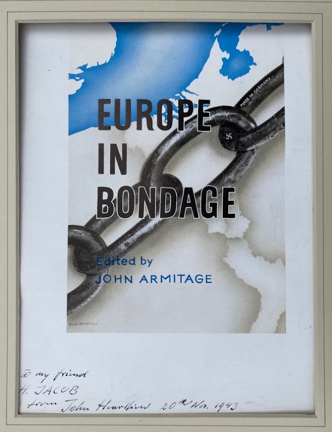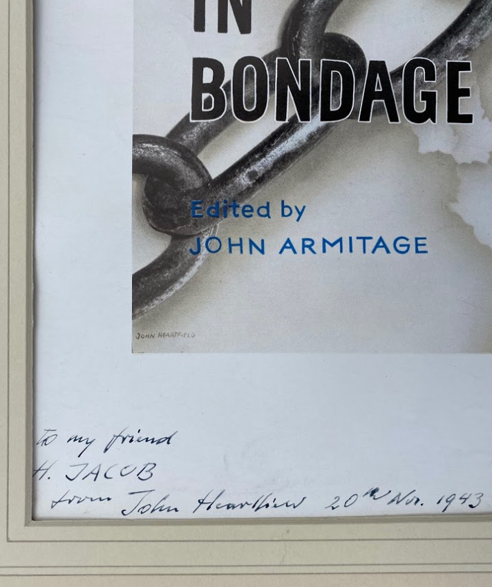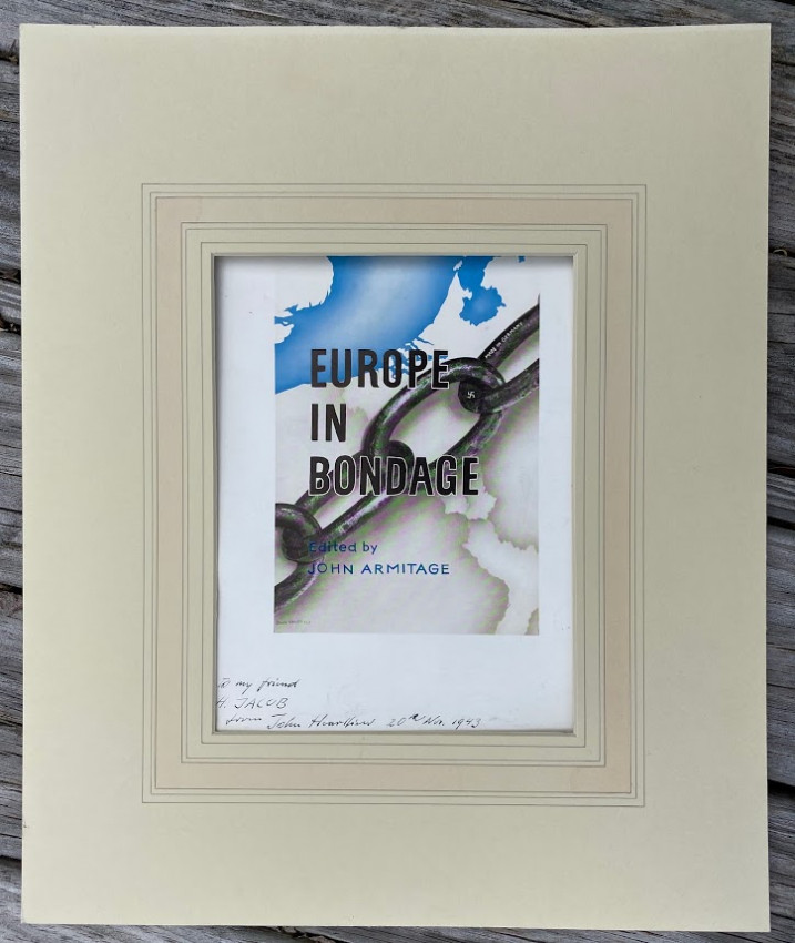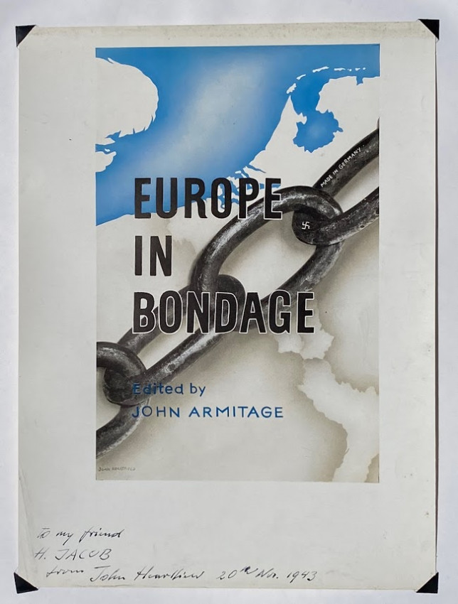 An inscribed progress proof of Heartfield’s design for the upper cover of the dust-jacket of ‘Europe in Bondage Edited by John Armitage’ [London: Nov. 1943 or earlier]. Colored proof on coated paper (sheet size: 11 3/8 x 8 3/8in; 288 x 213mm), signed in the plate ‘John Heartfield’, the lower left corner of the sheet inscribed in blue ink ‘To my friend / H. Jacob / from John Heartfield 20th Nov. 1943’.