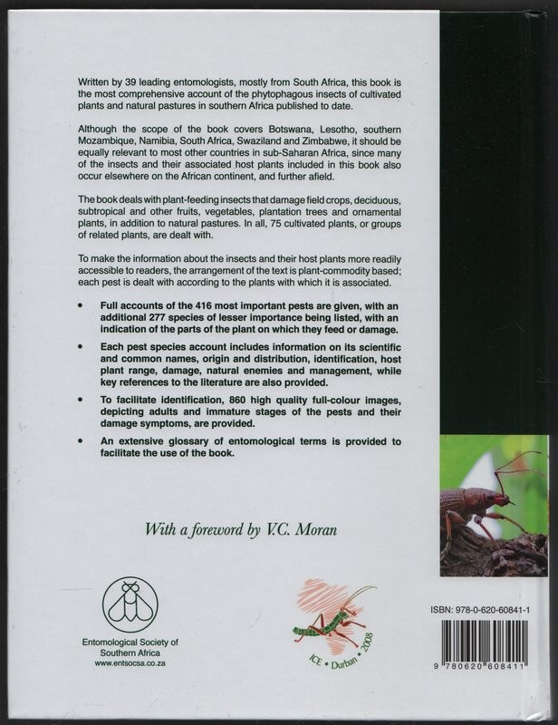 The most comprehensive account of phytophagous insects of cultivated plants and natural pastures in South Africa published. Covers Botswana, Lesotho, southern Mozambique, Namibia, South Africa, Swaziland, and Zimbabwe and relevant to most countries in sub-Saharan Africa. Deals with the plant-eating insects that damage field crops, deciduous, subtropical, and other fruits. In all 75 cultivated plants, or related groups, are dealt with. Full accounts of over 416 important pests plus 277 of lesser importance. Including scientific & common names, origin & distribution, identification, host plant range, damage, natural enemies, management, and key references in the literature. 860 colour images depicting adults and immature stages, damage symptoms. Extensive glossary of terms.