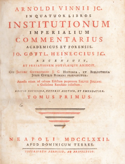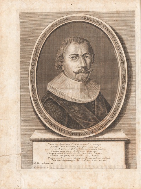 Arnold Vinnius (4 January 1588, Monster - 1 September 1657, Leiden) was one of the leading jurists of the 17th century in the Netherlands.This work was reprinted 54 times from the first 1642 Leiden edition to the 1867 Spanish translation. (Wikepedia).