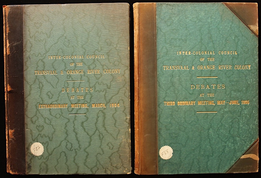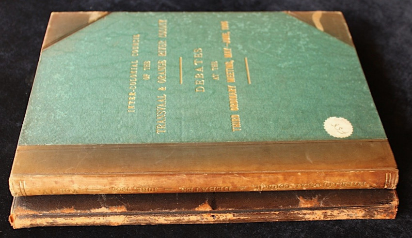 Three-quarter leather bindings with green cloth boards. Early Johannesburg publications.