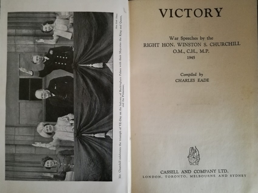 - 1945. Victory. War Speeches by the Rt Hon Winston S Churchill. Compiled by Charles Eade. 1946, first edition. 239 pp of text + frontispiece and 5 other plates. Near Very Good.