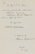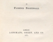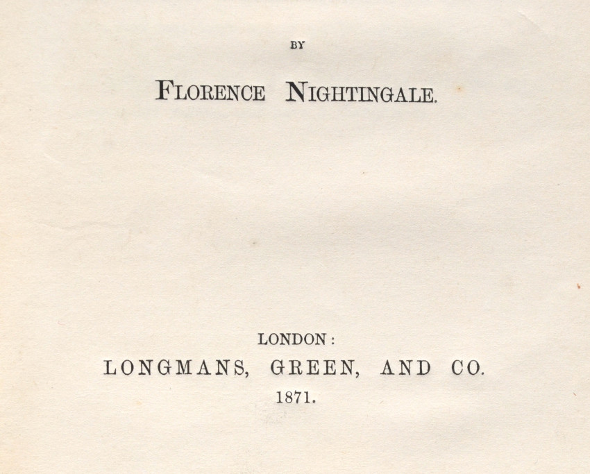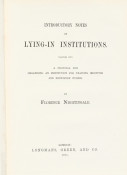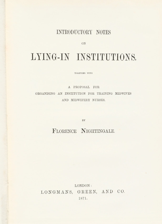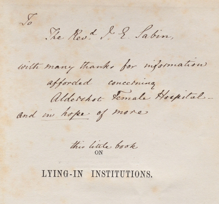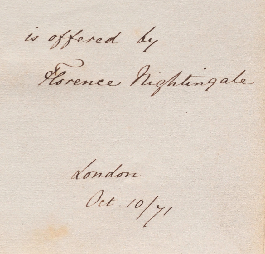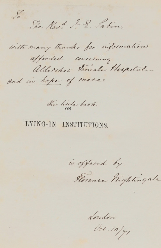 Inscribed, Signed and Dated by the author on the first title page. The inscription to Rev. Labin reads: "With many thanks for information afforded concerning Aldershot Female Hospital, and in hope of many more. This little book 'On Lying-in Institutions', is offered by Florence Nightingale. London Oct 10/71"