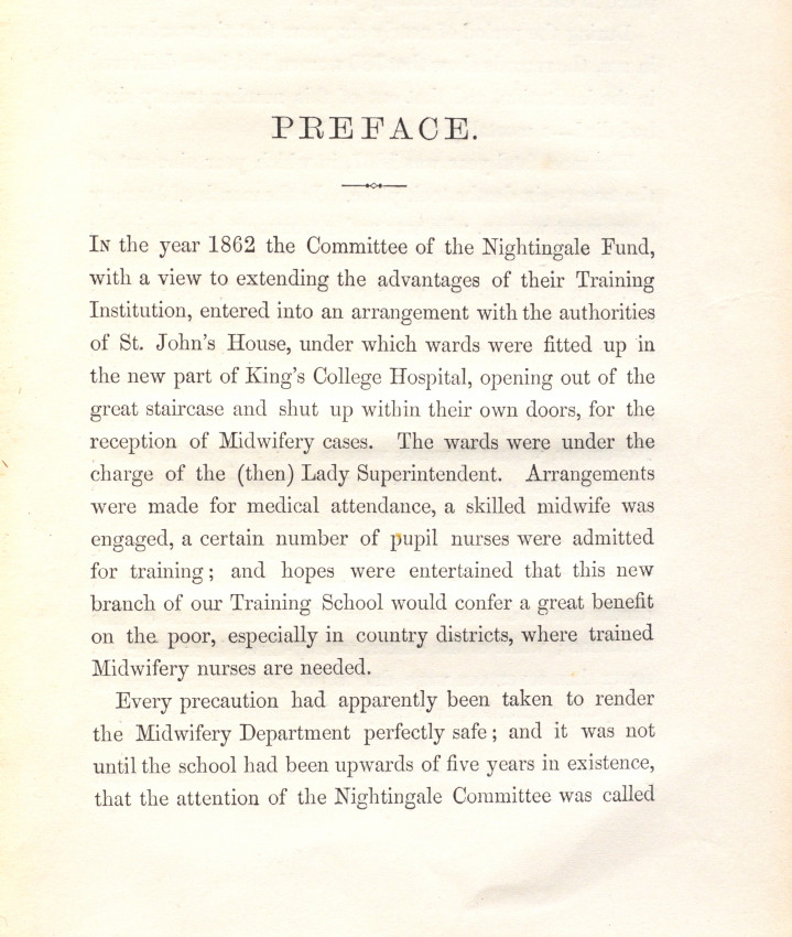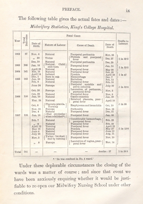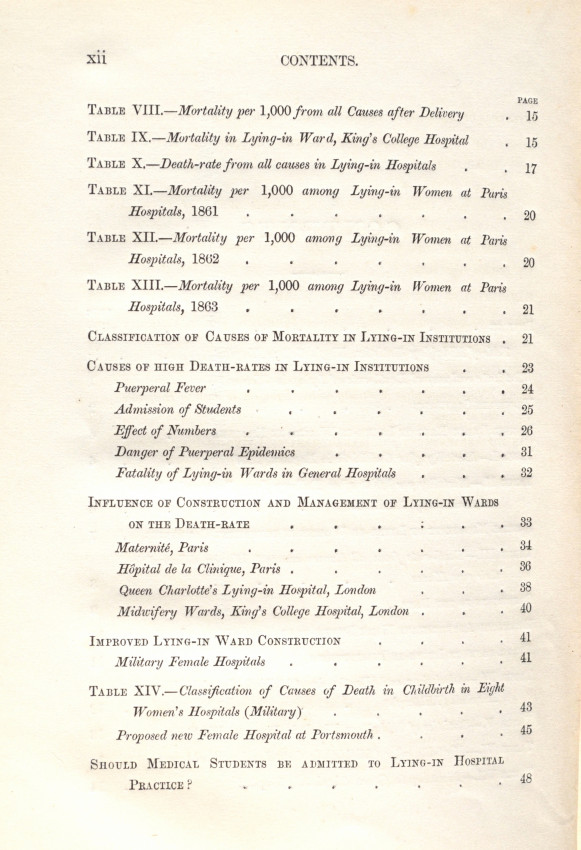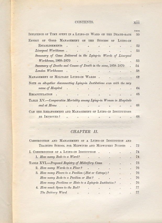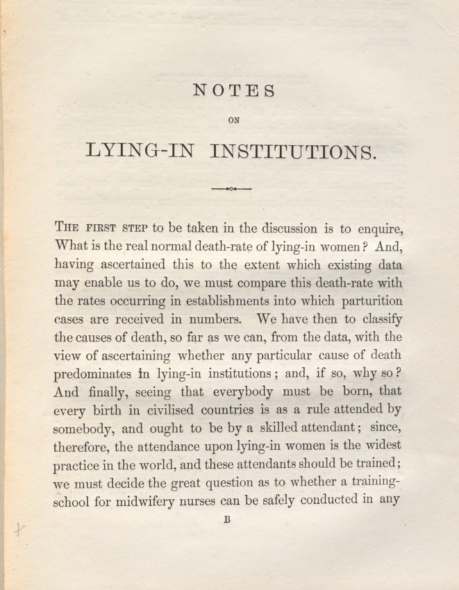 "Nightingale discusses the maternal death statistics of lying-in institutions and makes suggestions, with accompanying plans, for changes to hospital layouts which could reduce rates of infection and maternal death". -Royal College of Obstetricians and Gynaecologists.
