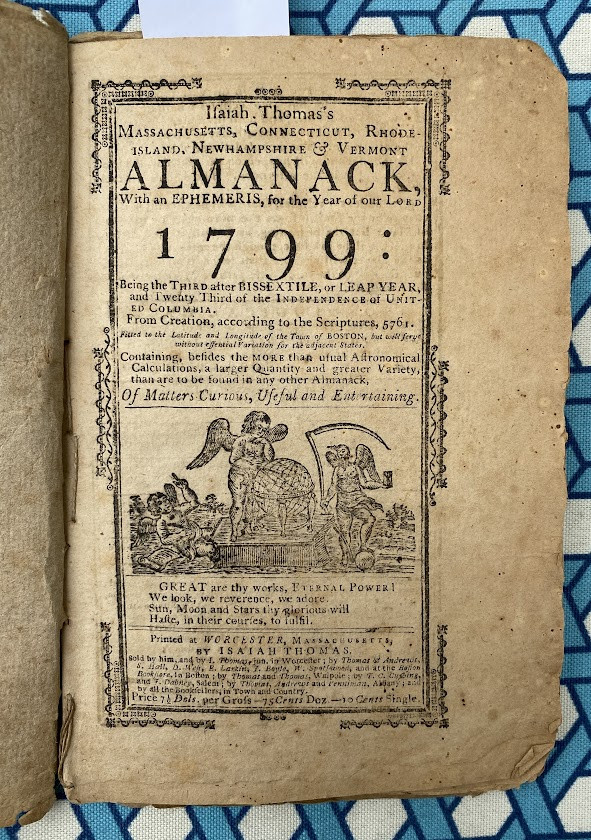 Isaiah THOMAS (1749-1831). Isaiah Thomas's Massachusetts, Connecticut, Rhode Island, New Hampshire & Vermont Almanack with an Ephemeris, for the Year of Our Lord 1799. Worcester, Mass.: [1798]. 12mo. (7 3/8 x 5 inches; 187 x 127 mm). Pp.[48]. Illustrations. Untrimmed (lightly toned). Vernacular binding: stitched into contemporary toned paper wrappers. Provenance: