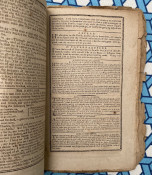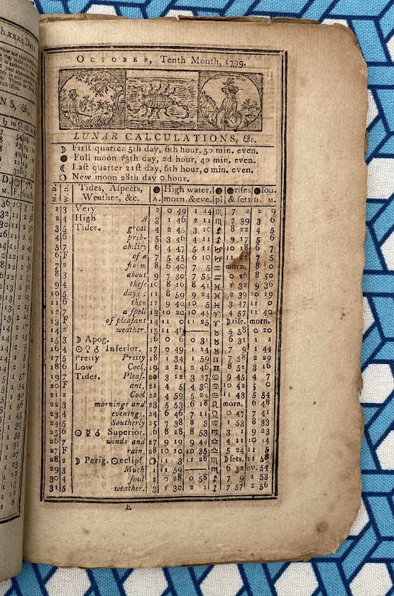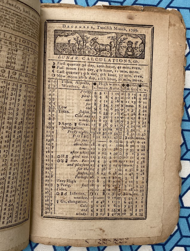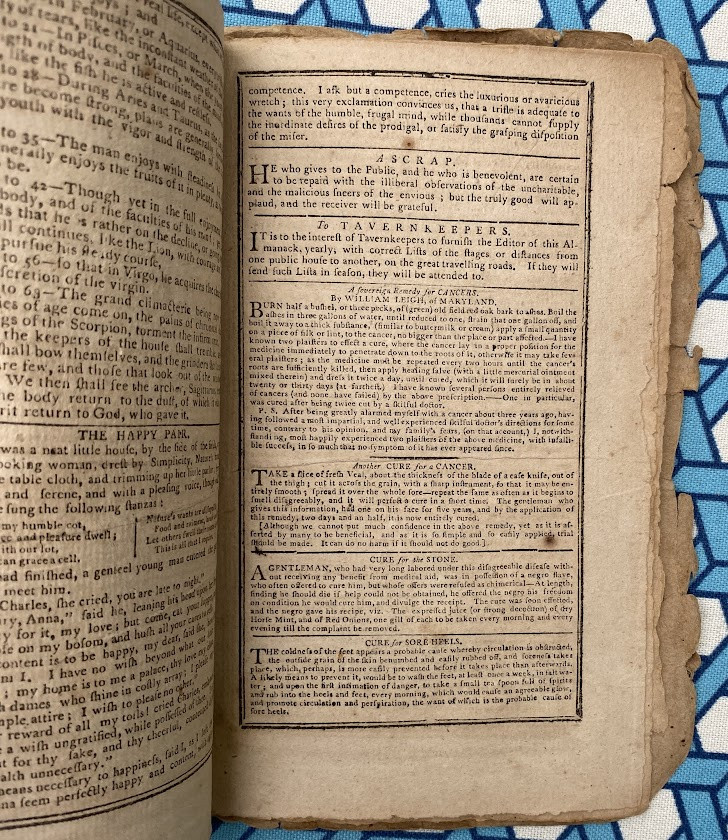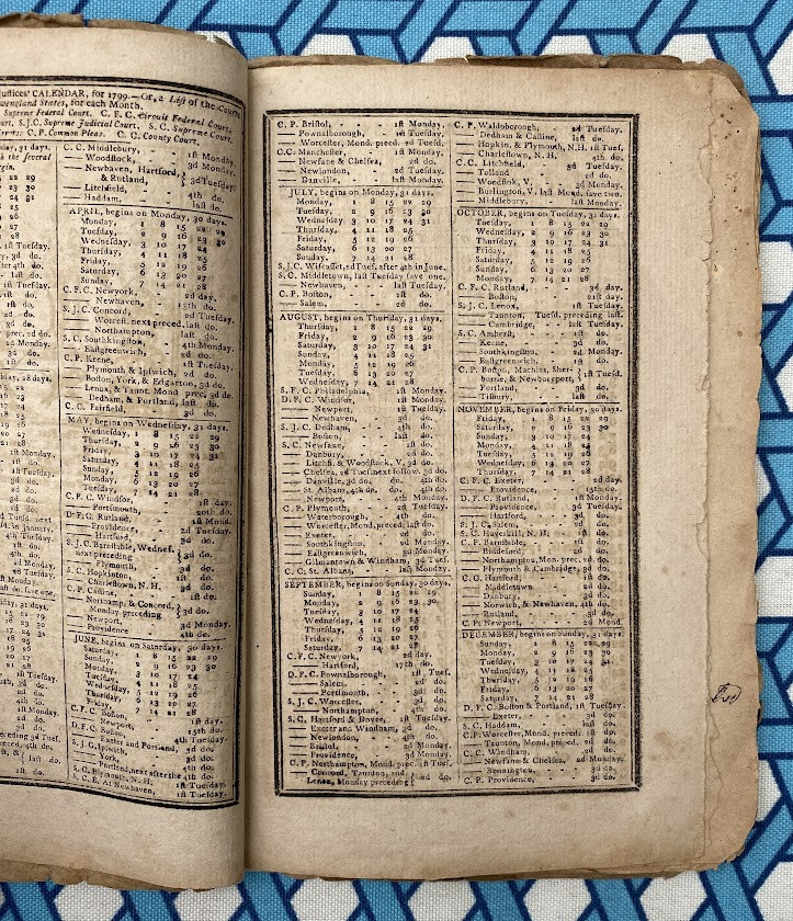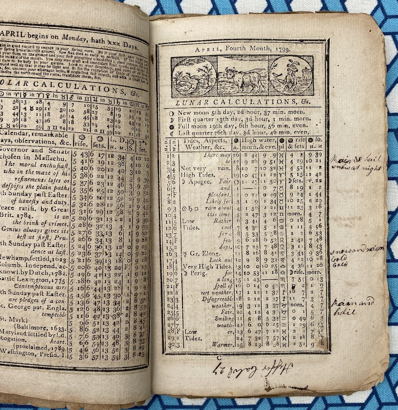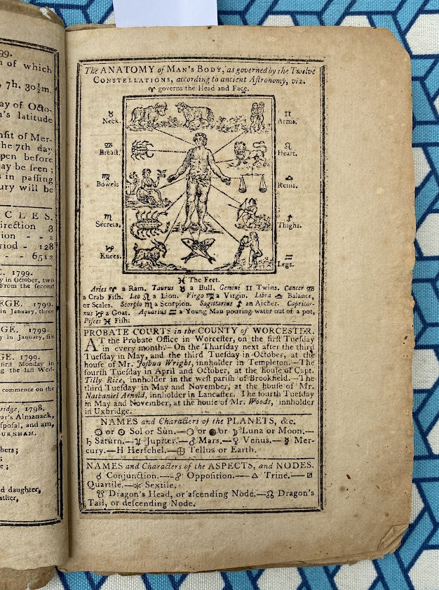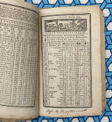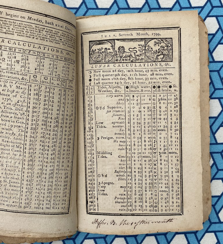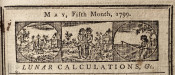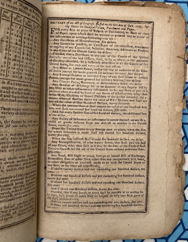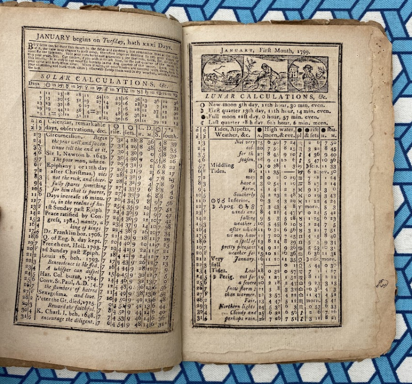 First edition. This Almanac lists vacation schedules for Dartmouth, Harvard, Rhode Island, and Williams Colleges; currency and interest tables, stagecoaches from Boston to various points, tables of distances with inns and innkeepers; an abstract of the Act laying a tax on slaves and houses; an advertisement for Thomas's Worcester bookstore; cures for cancer and other health nostrums. Evans 34652; Drake 3599.
